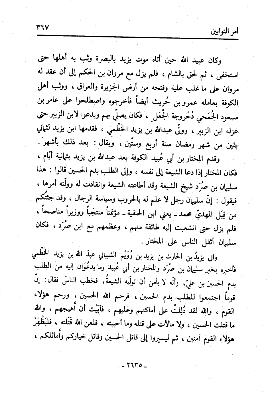 وقدم المختار بْن أَبِي عبيد الكوفة بَعْد عَبْد اللَّهِ بْن يَزِيد بثمانية أَيَّام، فكان المختار إِذَا دعا الشيعة إِلَى نَفْسه، وإلى الطلب بدم الْحُسَيْن قَالُوا: هَذَا سُلَيْمَان بْن صرد شيخ الشيعة وَقَدْ أطاعته الشيعة وانقادت لَهُ وولته أمرها، فَيَقُولُ: إِن سُلَيْمَان رجل لا علم لَهُ بالحروب وسياسة الرجال، وَقَدْ جئتكم من قبل الْمَهْدِي مُحَمَّد- يَعْنِي ابْن الحنفية- مؤتمنا منتجبا ووزيرًا مناصحًا، فلم يزل حَتَّى انشعبت إِلَيْهِ طائفة مِنْهُم، وعظمهم مَعَ ابْن صرد، فكان سُلَيْمَان أثقل النَّاس عَلَى المختار.