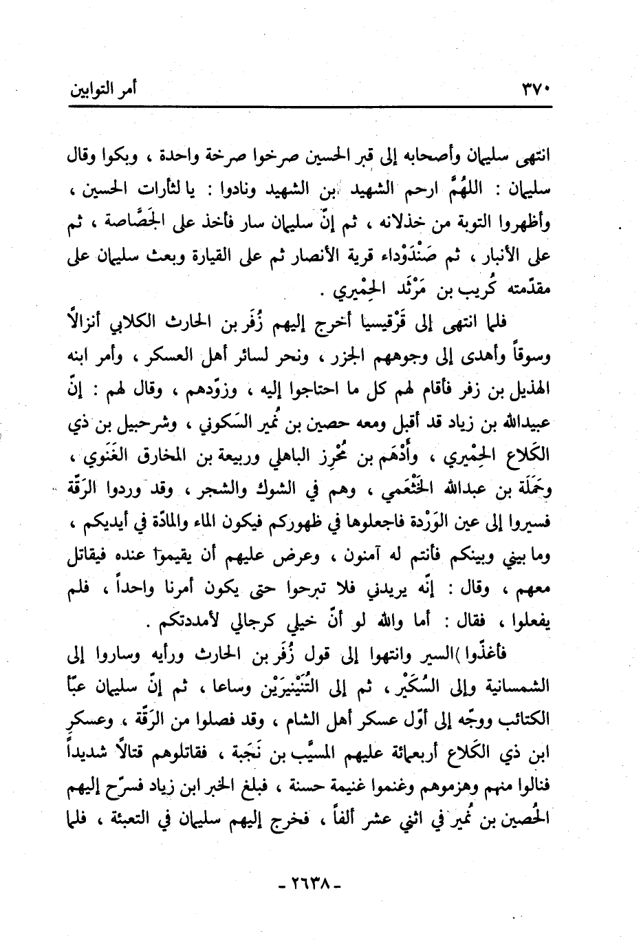 انتهى سُلَيْمَان وأَصْحَابه إِلَى قبر الْحُسَيْن صرخوا صرخة واحدة، وبكوا وَقَالَ سُلَيْمَان: اللَّهُمَّ ارحم الشهيد بْن الشهيد ونادوا: يا لثأرات الْحُسَيْن، وأظهروا التوبة من خذلانه، ثُمَّ إِن سُلَيْمَان سار فأخذ عَلَى الجصاصة، ثُمَّ عَلَى الأنبار، ثُمَّ صندوداء قرية الأنصار ثُمَّ عَلَى القيارة وبعث سُلَيْمَان عَلَى مقدمته كريب بْن مرثد الحميري.