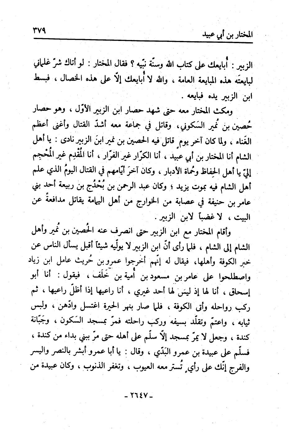 الزبير: أُبَايِعُكَ عَلَى كِتَابِ اللَّهِ وَسُنَّةِ نَبِيِّهِ؟ فَقَالَ المختار: لو أتاك شر غلماني لبايعته هذه المبايعة العامة، والله لا أبايعك إلا عَلَى هذه الخصال، فبسط ابْن الزُّبَيْر يده فبايعه.