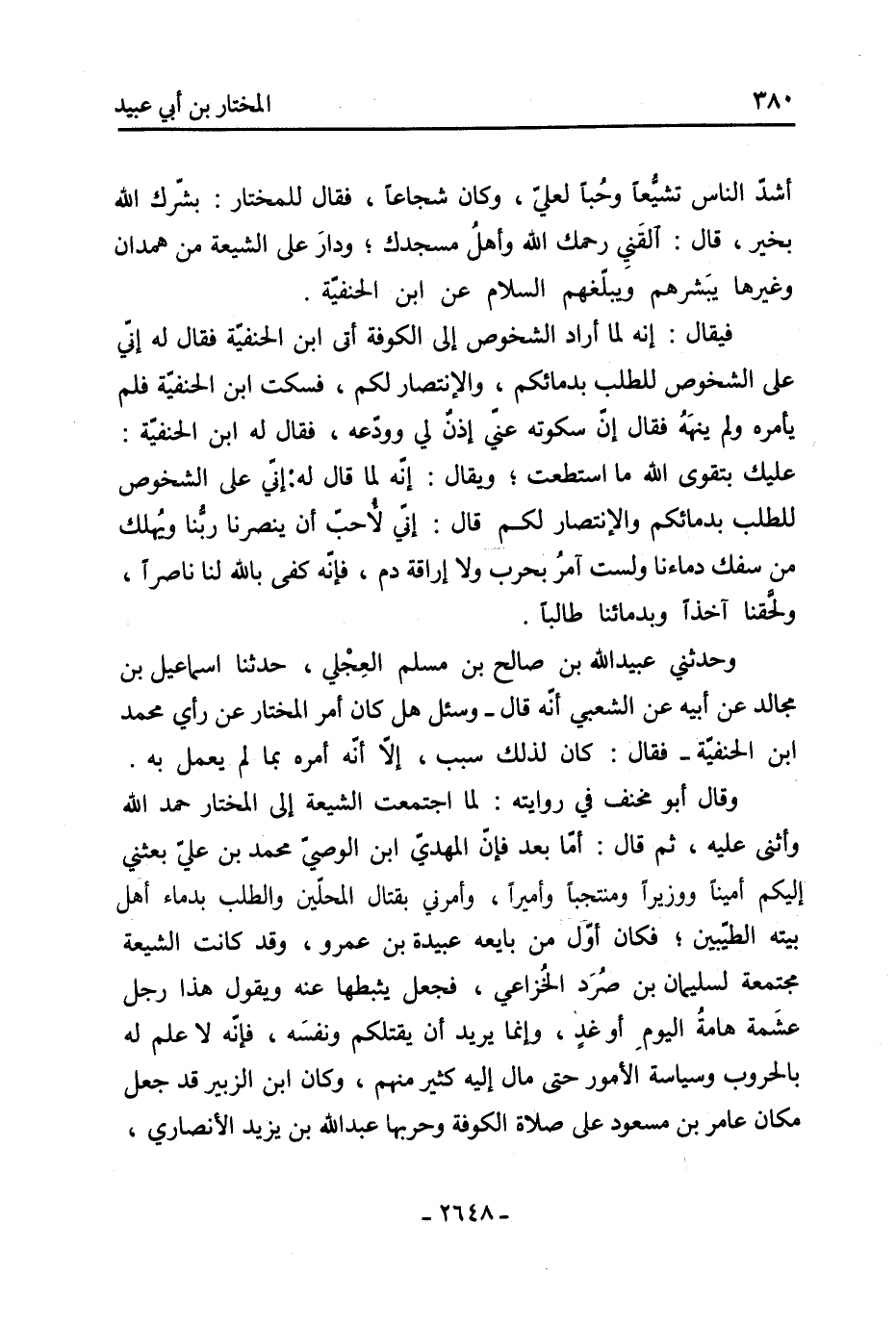 وَحَدَّثَنِي عُبَيْد اللَّهِ بْن صَالِح بْن مُسْلِم الْعِجْلِيُّ، حَدَّثَنَا إِسْمَاعِيلَ بْنِ مُجَالِدٍ عَنْ أَبِيهِ عَنْ الشَّعْبِيِّ أَنَّهُ قَالَ- وسئل هل كَانَ أمر المختار عَنْ رأي محمد ابن الحنفية- فَقَالَ: كَانَ لِذَلِكَ سبب، إلا أَنَّهُ أمره بِمَا لَمْ يعمل بِهِ.