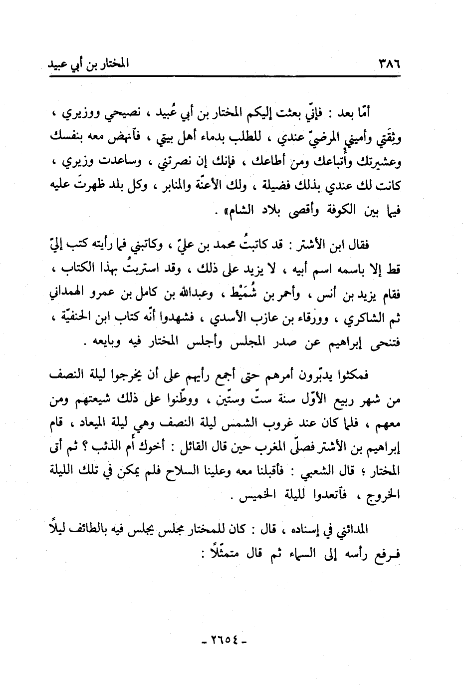 أما بَعْد: فإني بعثت إليكم المختار بْن أَبِي عبيد، نصيحي ووزيري، وثقتي وأميني المرضي عندي، للطلب بدماء أهل بَيْتِي، فانهض مَعَهُ بنفسك وعشيرتك وأتباعك ومن أطاعك، فإنك إِن نصرتني، وساعدت وزيري، كانت لَك عندي بِذَلِكَ فضيلة، ولك الأعنة والمنابر، وكل بلد ظهرت عَلَيْهِ فيما بَيْنَ الكوفة وأقصى بلاد الشام» .