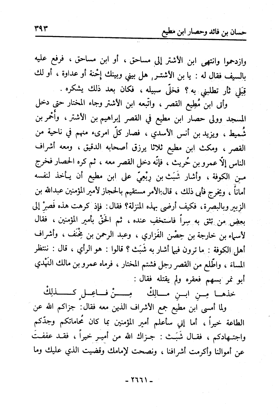 وأتى ابْن مطيع القصر، واتبعه ابْن الأشتر وجاء المختار حَتَّى دَخَلَ الْمَسْجِد وولى حصار ابْن مطيع فِي القصر إِبْرَاهِيم بْن الأشتر، وأحمر بْن شميط، ويزيد بْن أَنَس الأسدي، فصار كُل امرئ مِنْهُم فِي ناحية من القصر، ومكث ابْن مطيع ثلاثا يرزق أَصْحَابه الدقيق، ومعه أشراف النَّاس إلا عَمْرو بْن حريث، فَإِنَّهُ دَخَلَ القصر مَعَهُ، ثُمَّ كره الحصار فخرج من الكوفة، وأشار شبث بْن ربعي عَلَى ابْن مطيع أَن يأخذ لنفسه أمانًا، ويخرج فأبى ذَلِكَ، قَالَ: الأمر مستقيم بالحجاز لأمير الْمُؤْمِنيِنَ عَبْد اللَّهِ بْن الزُّبَيْر وبالبصرة، فكيف أرضى بِهَذِهِ المنزلة؟ فَقَالَ: فإذ كرهت هذه فصر إِلَى بَعْض من تثق بِهِ سرًا فاستخف عنده، ثُمَّ الحق بأمير الْمُؤْمِنيِنَ، فَقَالَ لأسماء بْن خارجة بْن حصن الفزاري، وعَبْد الرَّحْمَنِ بْن مخنف، وأشراف أهل الكوفة: مَا ترون فيما أشار بِهِ شبث؟ قَالُوا: هُوَ الرأي، قَالَ: ننتظر المساء، واطلع من القصر رجل فشتم المختار، فرماه عَمْرو بْن مَالِك النهدي أَبُو نمر بسهم فعقره وَلَمْ يقتله فَقَالَ: