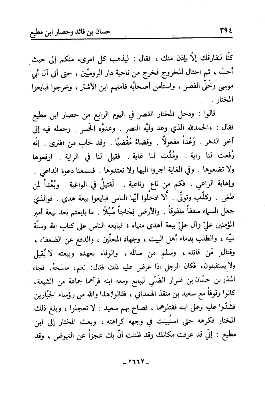 وإهابة الراعي. فكم من ناع وناعية. لقتيل فِي الواغية. وبعدًا لمن طغى. وكذب وتولى. ألا ادخلوا أيّها الناس فبايعوا بيعة هدى. فو الذي جعل السماء سقفًا ملفوقًا. وَالأَرْض فجاجًا سبلا. مَا بايعتم بَعْد بيعة أمِير الْمُؤْمِنيِنَ عَلِي وآل عَلِي بيعة أهدى منها» ، فبايعه النَّاس عَلَى كتاب اللَّه وسنة نبيه، والطلب بدماء أهل الْبَيْت، وجهاد المحلين، والدفع عَنِ الضعفاء، وقتال من قاتله، وسلم من سالمه، والوفاء بعهده وبيعته لا يقيل ولا يستقيلون، فكان الرجل إِذَا عرض عَلَيْهِ ذَلِكَ فَقَالَ: نعم، ماسحه، فجاء المنذر بْن حسان بْن ضرار الضبي ليبايع ومعه ابنه فرآهما جَمَاعَة من الشيعة، كَانُوا وقوفا مَعَ سَعِيد بْن منقذ الهمداني، فَقَالُوا: هَذَا والله من رؤساء الجبارين فشدوا عَلَيْهِ وعلى ابنه فقتلوهما، فصاح بِهِمْ سَعِيد: لا تعجلوا، وبلغ ذَلِكَ المختار فكرهه حَتَّى استبينت فِي وجهه كراهته، وبعث المختار إِلَى ابْن مطيع: إني قَدْ عرفت مكانك وَقَدْ ظننت أَن بك عجزًا عَنِ النهوض، وقد