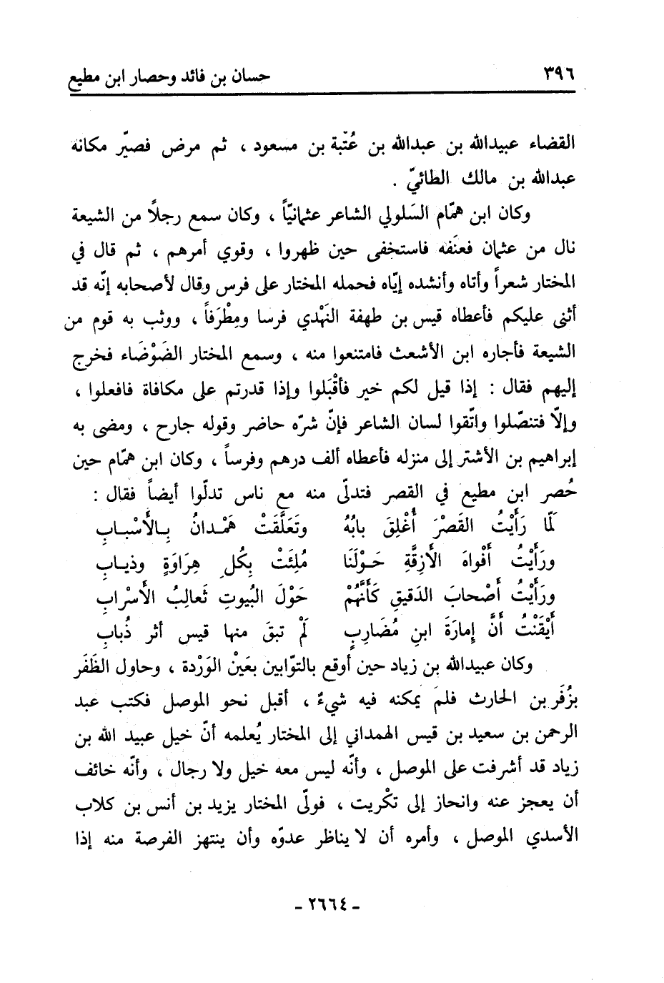 وَكَانَ ابْن همام السلولي الشاعر عثمانيًا، وَكَانَ سمع رجلا من الشيعة نال من عُثْمَان فعنفه فاستخفى حِينَ ظهروا، وقوي أمرهم، ثُمَّ قَالَ فِي المختار شعرًا وأتاه وأنشده إياه فحمله المختار عَلَى فرس وَقَالَ لأَصْحَابه إنه قَدْ أثنى عليكم فأعطاه قَيْس بْن طهفة النهدي فرسًا ومطرفًا، ووثب بِهِ قوم من الشيعة فأجاره ابْن الأشعث فامتنعوا منه، وسمع المختار الضوضاء فخرج إليهم فَقَالَ: إِذَا قيل لكم خير فأقبلوا وإذا قدرتم عَلَى مكافأة فافعلوا، وإلا فتنصلوا واتقوا لسان الشاعر فَإِن شره حاضر وقوله جارح، ومضى بِهِ إِبْرَاهِيم بْن الأشتر إِلَى منزله فأعطاه ألف درهم وفرسًا، وَكَانَ ابْن همام حِينَ حصر ابْن مطيع فِي القصر فتدلى منه مَعَ ناس تدلوا أيضًا فَقَالَ: