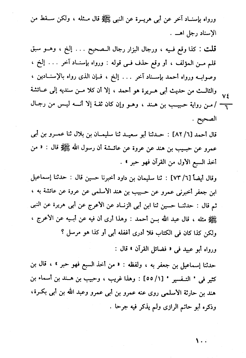 قال أحمد [6/ 82]: حدثنا أبو سعيد ثنا سليمان بن بلال ثنا عمرو بن أبي عمرو عن حبيب بن هند عن عروة عن عائشة أن رسول اللَّه -صلى اللَّه عليه وسلم- قال: "من أخذ السبع الأول من القرآن فهو حبر".