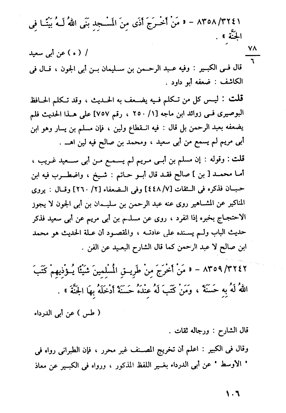 3241/ 8358 - "مَنْ أَخْرَجَ أَذَى منَ المَسْجِدِ بَنَى اللَّهُ لَهُ بَيْتًا فِي الجَنَّةِ".