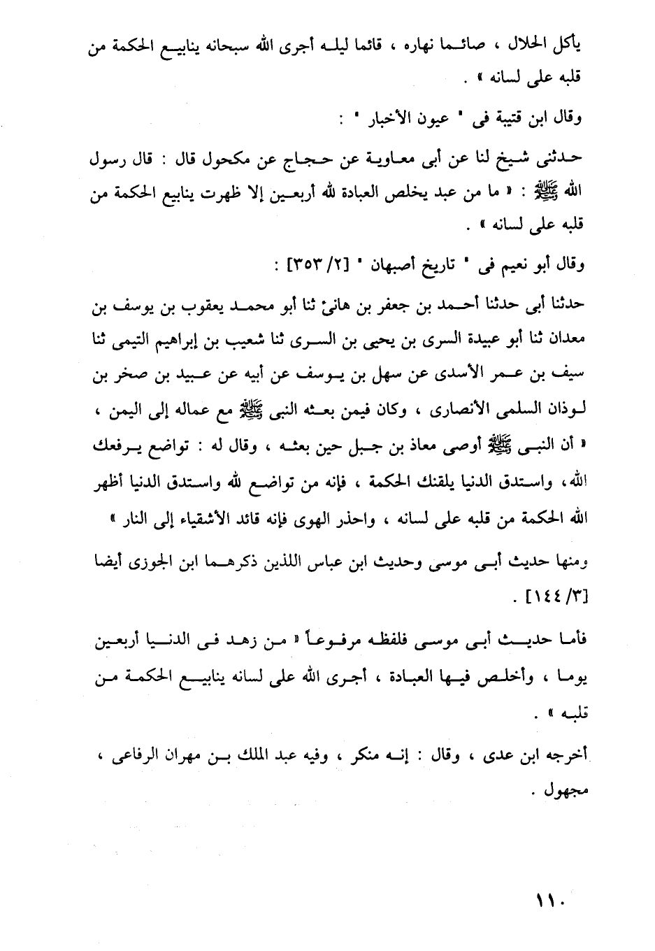 حدثنى شيخ لنا عن أبي معاوية عن حجاج عن مكحول قال: قال رسول اللَّه -صلى اللَّه عليه وسلم-: "ما من عبد يخلص العبادة للَّه أربعين إلا ظهرت ينابيع الحكمة من قلبه على لسانه".
