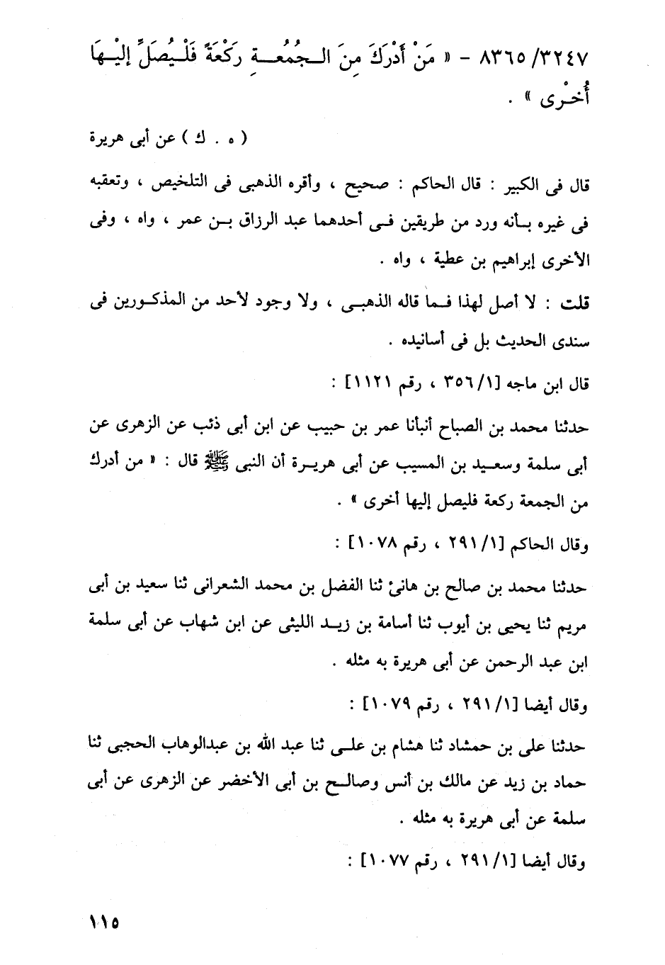 3247/ 8365 - "مَنْ أَدْرَكَ مِنَ الجُمُعةِ رَكْعَةً فَلْيُصَلِّ إِليْهَا أُخْرى".