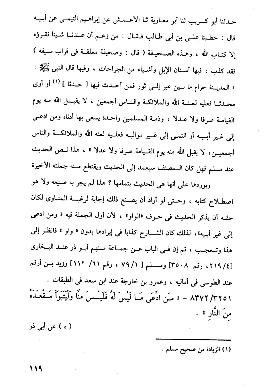 حدثنا أبو كُريب ثنا أبو معاوية ثنا الأعمش عن إبراهيم التيمى عن أبيه قال: خطبنا على بن أبي طالب فقال: من زعم أن عندنا شيئًا نقرؤه إلا كتاب اللَّه، وهذه الصحيفة (قال: وصحيفة معلقة في قراب سيفه) فقد كذب، فيها أسنان الإبل وأشياء من الجراحات، وفيها قال النبي -صلى اللَّه عليه وسلم-: "المدينة حرام ما بين عير إلى ثور فمن أحدث فيها [حدثا] (¬1) أو آوى محدثا فعليه لعنة اللَّه والملائكة والناس أجمعين، لا يقبل اللَّه منه يوم القيامة صرفا ولا عدلا، وذمة المسلمين واحدة يسعى بها أدناه ومن ادعى إلى غير أَبيه أو انتمى إلى غير مواليه فعليه لعنه اللَّه والملائكة والناس أجمعين، لا بقبل اللَّه منه يوم القيامة صرفا ولا عدلا"، هذا نص الحديث عند مسلم فهل كان المصنف سيعمد إلى الحديث ويقتطع منه جملته الأخيرة ويوردها على أنها هي الحديث بتمامها؟ هذا لم يجر به صنيعه ولا هو اصطلاح كتابه، وحتى لو أراد أن يصنع ذلك إجابة لرغبة المناوى لكان حقه أن يذكر الحديث في حرف "الواو", لأن أول الجملة فيه "ومن ادعى إلى غير أَبيه"، لذلك كان الشارح كذابا في إيرادها بدون "واو" فانظر إلى هذا وتعجب، ثم إن في الباب عن جماعة منهم أبو ذر عند البخارى [4/ 219، رقم 3508] ومسلم [1/ 79، رقم 61/ 112] وزيد بن أرقم عند الطوسى في أماليه، وعمرو بن خارجة عند ابن سعد في الطبقات.