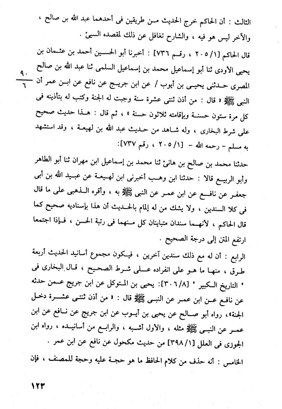 الرابع: أن له مع ذلك سندين آخرين، فيكون مجموع أسانيد الحديث أربعة طرق، منها ما هو على انفراده على شرط الصحيح، قال البخارى في "التاريخ الكبير" [8/ 306]: يحيى بن المتوكل عن ابن جريج عمن حدثه عن نافع عن ابن عمر عن النبي -صلى اللَّه عليه وسلم- قال: "من أذن ثنتى عشرة دخل الجنة"، رواه أبو صالح عن يحيى بن أيوب عن ابن جريج عن نافع عن ابن عمر عن النبي -صلى اللَّه عليه وسلم- مثله، والأول أشبه، والرابع من أسانيده، رواه ابن الجوزى في العلل [1/ 398] من حديث مكحول عن نافع عن ابن عمر.