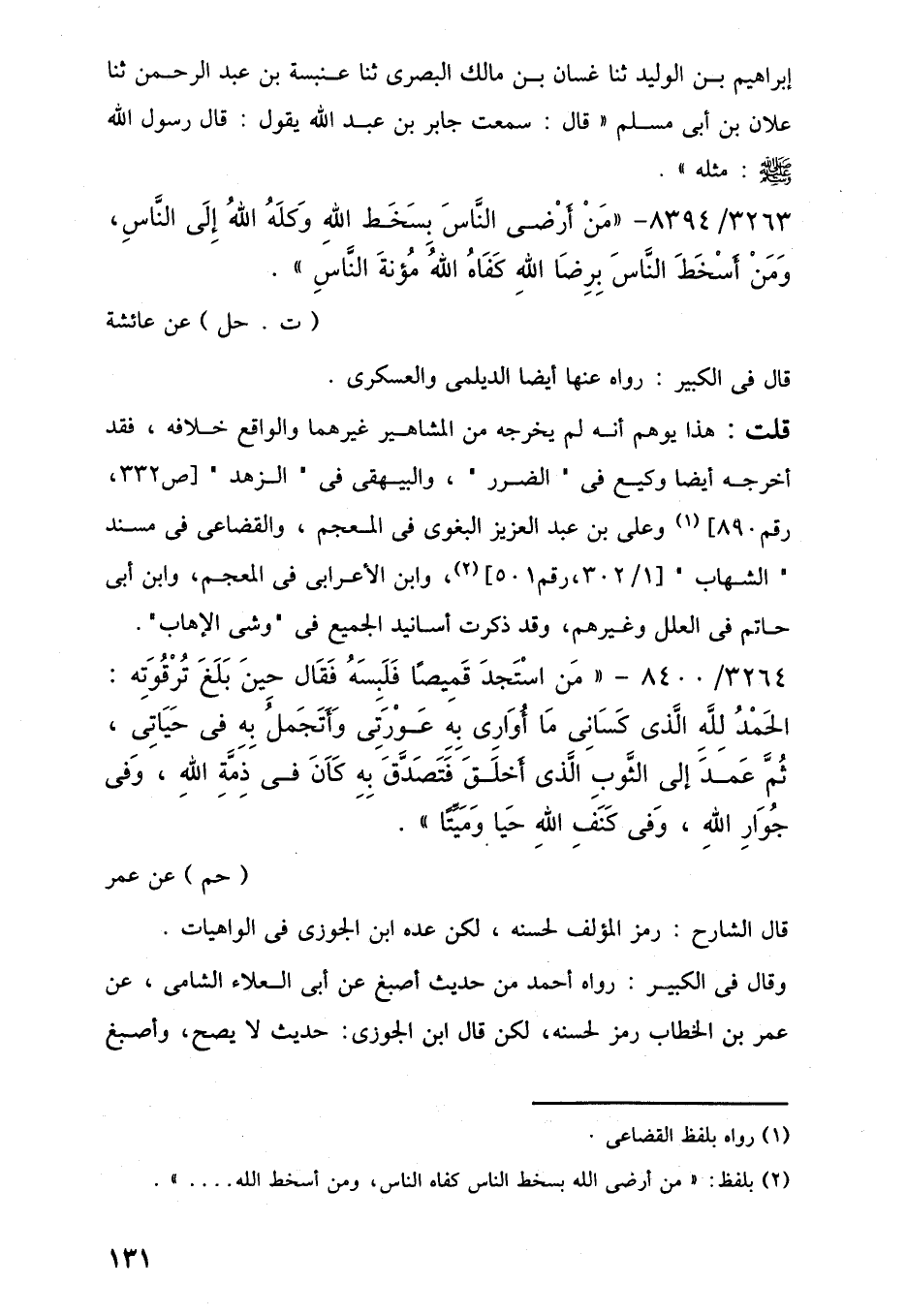 3263/ 8394 - "مَنْ أَرْضى النَّاسَ بِسَخَط اللَّهِ وَكلَهُ اللَّهُ إِلَى النَّاسِ، وَمَنْ أَسْخَطَ النَّاسَ بِرِضَا اللَّهِ كَفَاهُ اللَّهُ مُؤنةَ النَّاسِ".