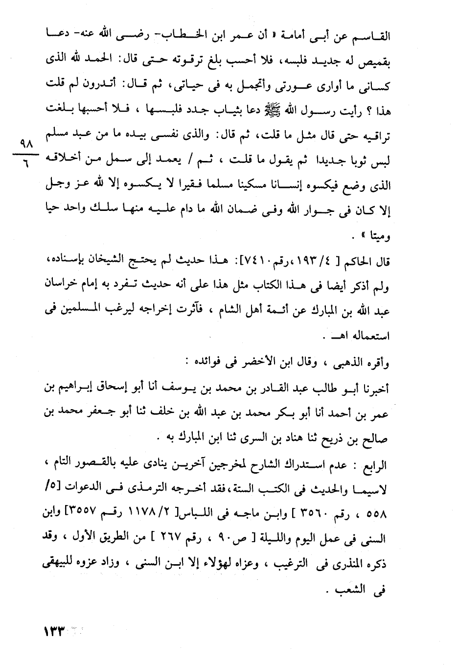 الرابع: عدم استدراك الشارح لمخرجين آخرين ينادى عليه بالقصور التام، لاسيما والحديث في الكتب الستة، فقد أخرجه الترمذى في الدعوات [5/ 558، رقم 3560] وابن ماجه في اللباس [2/ 1178، رقم 3557] وابن السنى في عمل اليوم والليلة [ص 90، رقم 267] من الطريق الأول، وقد ذكره المنذرى في "الترغيب" وعزاه لهؤلاء إلا ابن السنى، وزاد عزوه للبيهقى في الشعب.