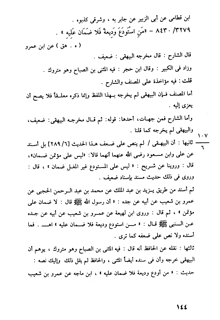ثانيها: أن البيهقى لم ينص على ضعف هذا الحديث [6/ 289] بل أسند عن على وابن مسعود رضي اللَّه عنهما أنهما قالا: "ليس على مؤتمن ضمان"، قال: وروينا عن شريح: "ليس على المستودع غير المغل ضمان"، قال: وروى في ذلك حديث مسند بإسناد ضعيف.