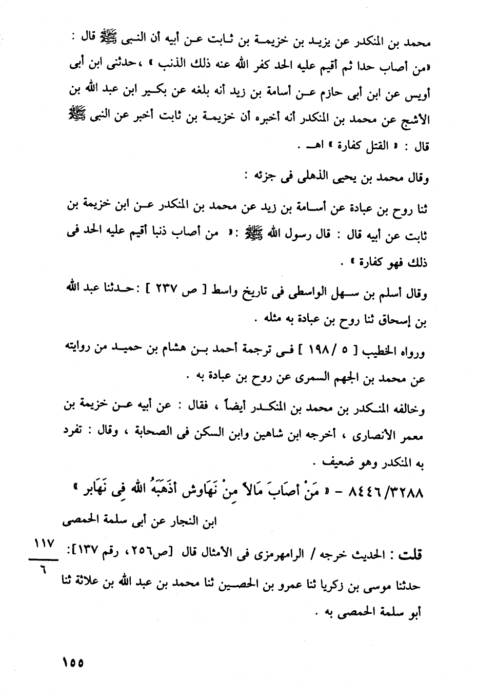 محمد بن المنكدر عن يزيد بن خزيمة بن ثابت عن أبيه أن النبي -صلى اللَّه عليه وسلم- قال: "من أصاب حدا ثم أقيم عليه الحد كفر اللَّه عنه ذلك الذنب"، حدثنى ابن أبي أويس عن ابن أبي حازم عن أسامة بن زيد أنه بلغه عن بكير ابن عبد اللَّه بن الأشج عن محمد بن المنكدر أنه أخبره أن خزيمة بن ثابت أخبر عن النبي -صلى اللَّه عليه وسلم- قال: "القتل كفارة" اهـ.