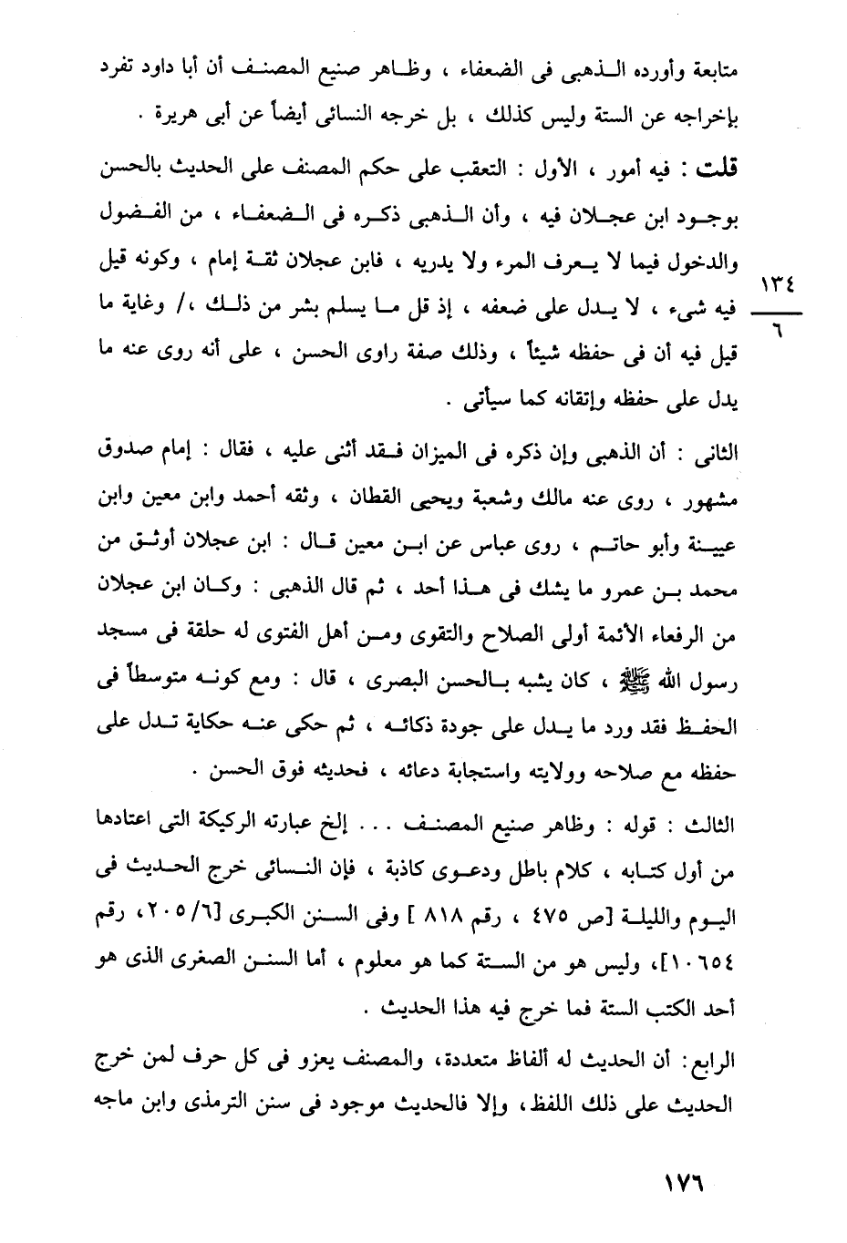 الثانى: أن الذهبى وإن ذكره في الميزان فقد أثنى عليه، فقال: إمام صدوق مشهور، روى عنه مالك وشعبة ويحيى القطان، وثقه أحمد وابن معين وابن عيينة وأبو حاتم، روى عباس عن ابن معين قال: ابن عجلان أوثق من محمد بن عمرو ما يشك في هذا أحد، ثم قال الذهبى: وكان ابن عجلان من الرفعاء الأئمة أولى الصلاح والتقوى ومن أهل الفتوى له حلقة في مسجد رسول اللَّه -صلى اللَّه عليه وسلم-، كان يشبه بالحسن البصرى، قال: ومع كونه متوسطًا في الحفظ فقد ورد ما يدل على جودة ذكائه، ثم حكى عنه حكاية تدل على حفظه مع صلاحه وولايته واستجابة دعائه، فحديثه فوق الحسن.