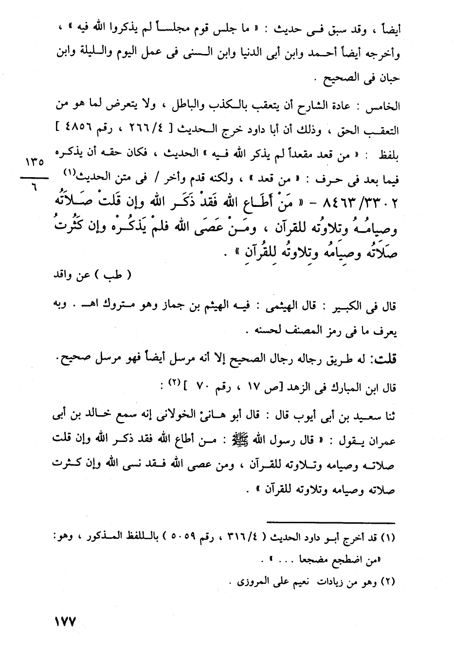 ثنا سعيد بن أبي أيوب قال: قال أبو هانئ الخولانى إنه سمع خالد بن أبي عمران يقول: "قال رسول اللَّه -صلى اللَّه عليه وسلم-: من أطاع اللَّه فقد ذكر اللَّه وإن قلت صلاته وصيامه وتلاوته للقرآن، ومن عصى اللَّه فقد نسى اللَّه وإن كثرت صلاته وصيامه وتلاوته للقرآن".