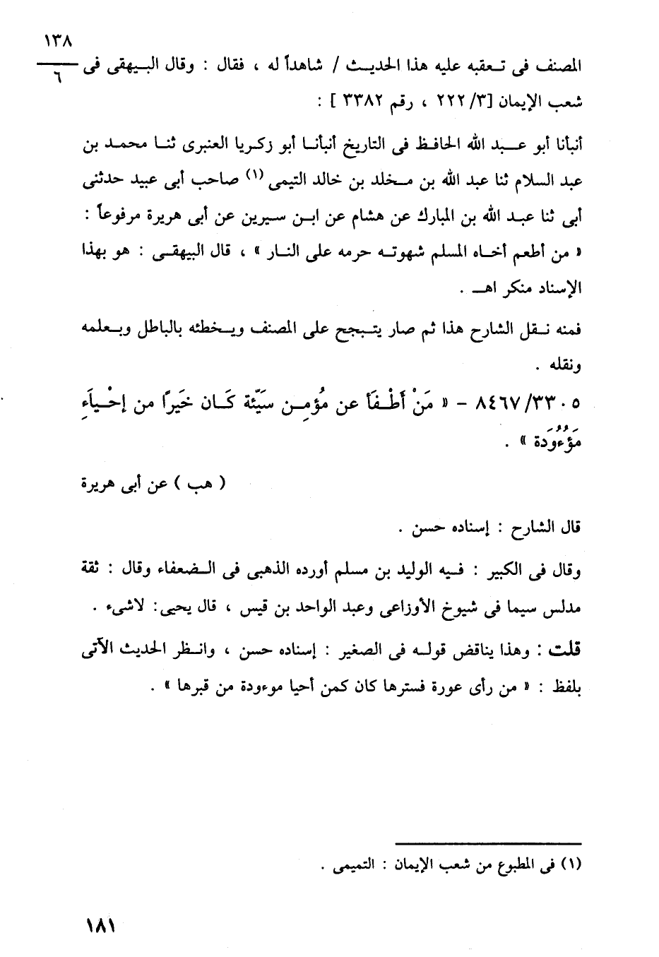 أنبأنا أبو عبد اللَّه الحافظ في التاريخ أنبأنا أبو زكريا العنبري ثنا محمد بن عبد السلام ثنا عبد اللَّه بن مخلد بن خالد التيمى (1) صاحب أبي عبيد حدثنى أبي ثنا عبد اللَّه بن المبارك عن هشام عن ابن سيرين عن أبي هريرة مرفوعًا: "من أطعم أخاه المسلم شهوته حرمه على النار"، قال البيهقى: هو بهذا الإسناد منكر اهـ.