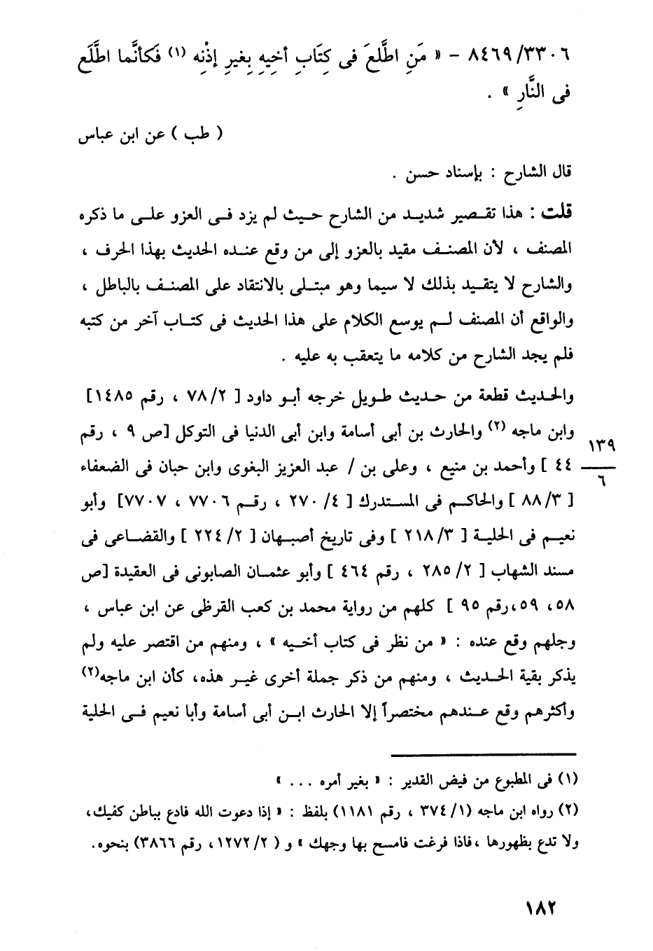 والحديث قطعة من حديث طويل خرجه أبو داود [2/ 78، رقم 1485] وابن ماجه (2) والحارث بن أبي أسامة وابن أبي الدنيا في التوكل [ص 9، رقم 44] وأحمد بن منيع، وعلي بن عبد العزيز البغوى وابن حبان في الضعفاء [3/ 88] والحاكم في المستدرك [4/ 270، رقم 7706، 7707] وأبو نعيم في الحلية [3/ 218] وفي تاريخ أصبهان [2/ 224] والقضاعى في مسند الشهاب [2/ 285، رقم 464] وأبو عثمان الصابونى في العقيدة [ص 58، 59، رقم 95] كلهم من رواية محمد بن كعب القرظي عن ابن عباس، وجلهم وقع عنده: "من نظر في كتاب أخيه"، ومنهم من اقتصر عليه ولم يذكر بقية الحديث، ومنهم من ذكر جملة أخرى غير هذه، كأن ابن ماجه (¬2) وأكثرهم وقع عندهم مختصرًا إلا الحارث ابن أبي أسامة وأبا نعيم في الحلية