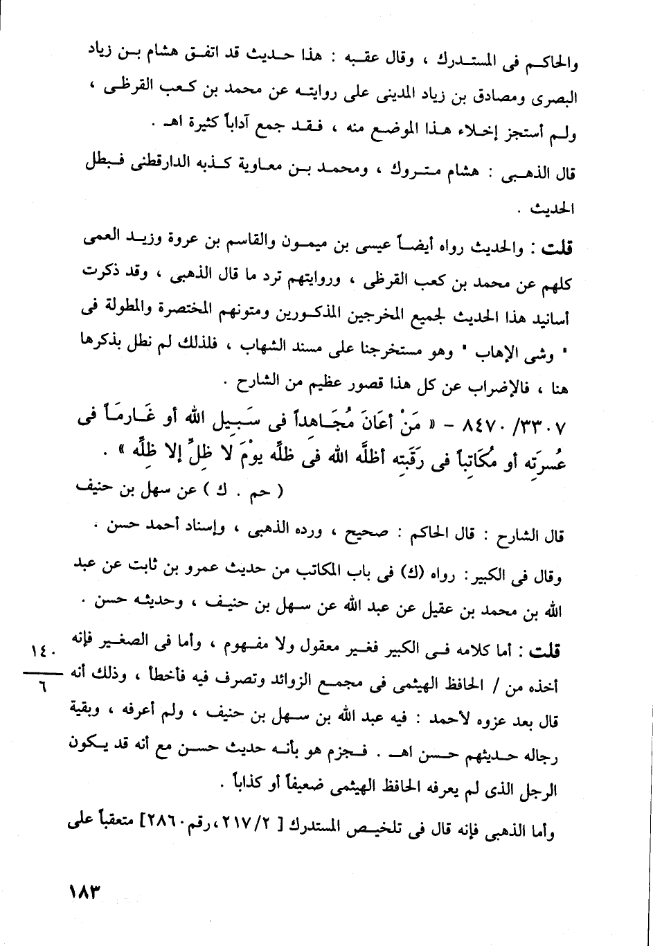 قلت: أما كلامه في الكبير فغير معقول ولا مفهوم، وأما في الصغير فإنه أخذه من الحافظ الهيثمى في مجمع الزوائد وتصرف فيه فأخطأ، وذلك أنه قال بعد عزوه لأحمد: فيه عبد اللَّه بن سهل بن حنيف، ولم أعرفه، وبقية رجاله حديثهم حسن اهـ. فجزم هو بأنه حديث حسن مع أنه قد يكون الرجل الذي لم يعرفه الحافظ الهيثمى ضعيفًا أو كذابًا.