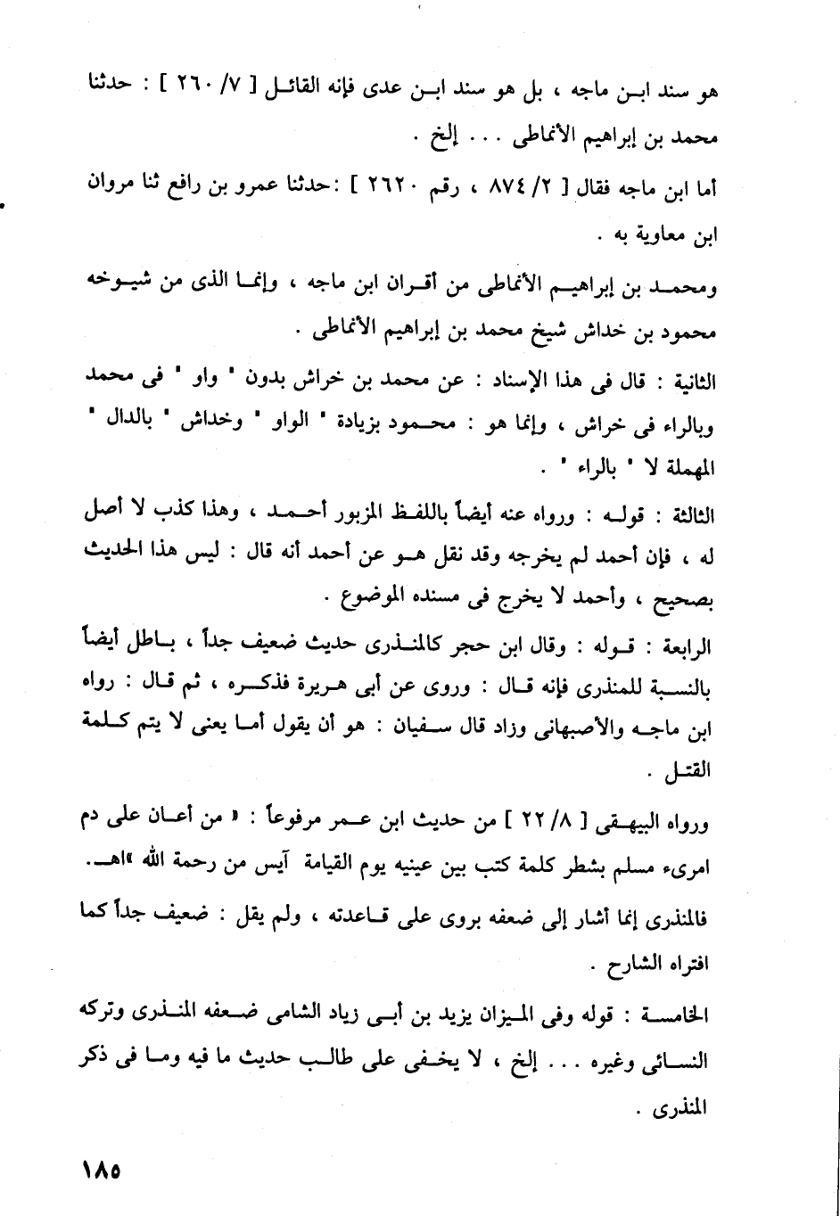 الرابعة: قوله: وقال ابن حجر كالمنذرى حديث ضعيف جدًا، باطل أيضًا بالنسبة للمنذرى فإنه قال: وروى عن أبي هريرة فذكره، ثم قال: رواه ابن ماجه والأصبهانى وزاد قال سفيان: هو أن يقول أما يعنى لا يتم كلمة القتل.