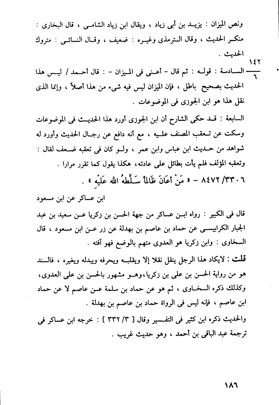 السادسة: قوله: ثم قال -أعنى في الميزان-: قال أحمد ليس هذا الحديث بصحيح باطل، فإن الميزان ليس فيه شيء من هذا أصلًا، وإنما الذي نقل هذا هو ابن الجوزى في الموضوعات.