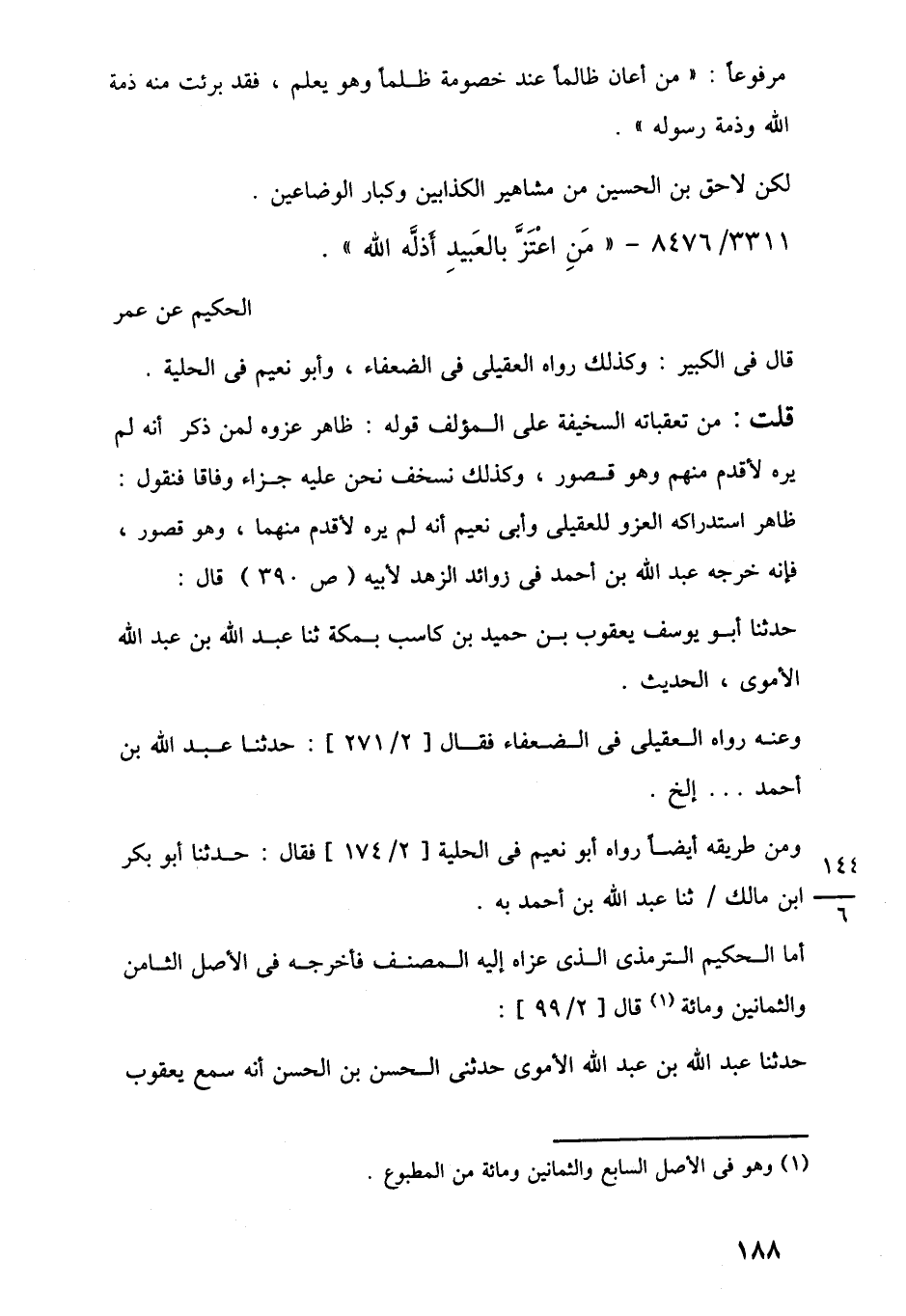 قلت: من تعقباته السخيفة على المؤلف قوله: ظاهر عزوه لمن ذكر أنه لم يره لأقدم منهم وهو قصور، وكذلك نسخف نحن عليه جزاء وفاقا فنقول: ظاهر استدراكه العزو للعقيلى وأبي نعيم أنه لم يره لأقدم منهما، وهو قصور، فإنه خرجه عبد اللَّه بن أحمد في زوائد الزهد لأبيه (ص 390) قال: