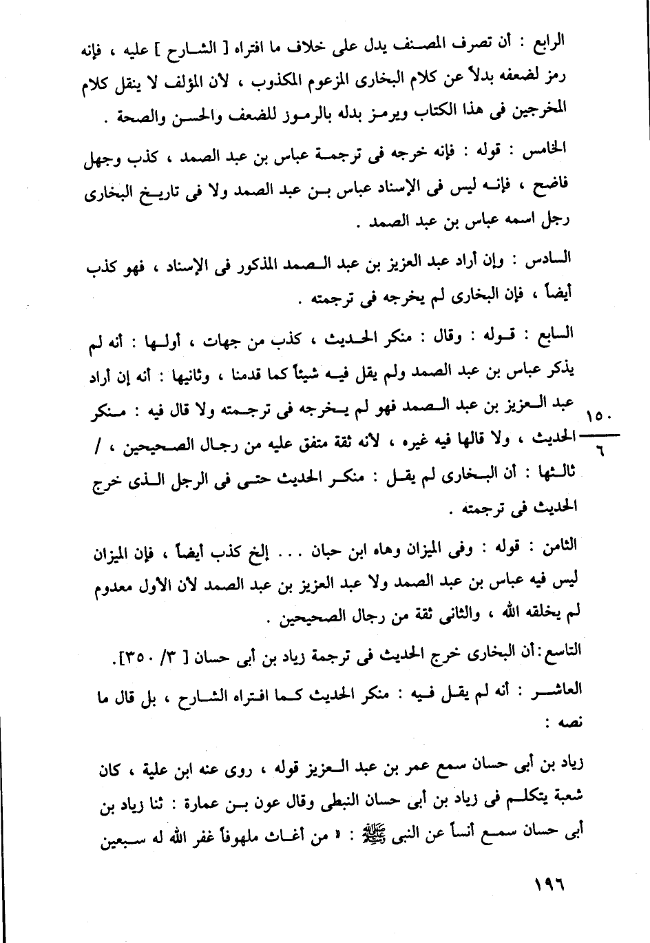 الخامس: قوله: فإنه خرجه في ترجمة عباس بن عبد الصمد، كذب وجهل فاضح، فإنه ليس في الإسناد عباس بن عبد الصمد ولا في تاريخ البخارى رجل اسمه عباس بن عبد الصمد.