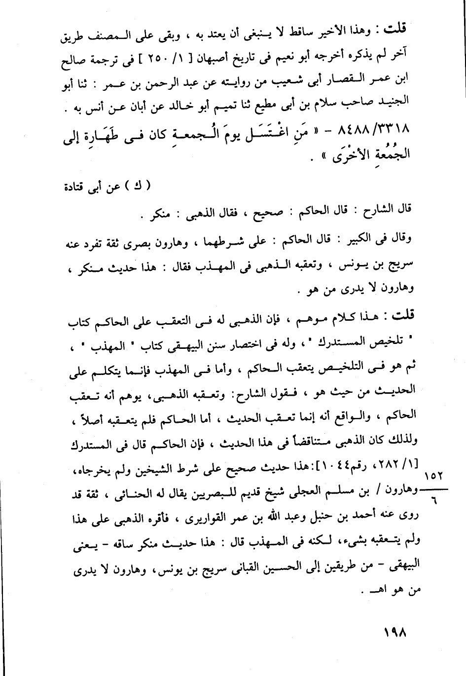 قلت: هذا كلام موهم، فإن الذهبى له في التعقب على الحاكم كتاب "تلخيص المستدرك"، وله في اختصار سنن البيهقى كتاب "المهذب"، ثم هو في التلخيص يتعقب الحاكم، وأما في المهذب فإنما يتكلم على الحديث من حيث هو، فقول الشارح: وتعقبه الذهبى، يوهم أنه تعقب الحاكم، والواقع أنه إنما تعقب الحديث، أما الحاكم فلم يتعقبه أصلًا، ولذلك كان الذهبى متناقضًا في هذا الحديث، فإن الحاكم قال في المستدرك [1/ 282، رقم 1044]: هذا حديث صحيح على شرط الشيخين ولم يخرجاه، وهارون بن مسلم العجلى شيخ قديم للبصريين يقال له الحنائى، ثقة قد روى عنه أحمد بن حنبل وعبد اللَّه بن عمر القواريرى، فأقره الذهبى على هذا ولم يتعقبه بشيء، لكنه في المهذب قال: هذا حديث منكر ساقه -يعنى البيهقى- من طريقين إلى الحسين القبانى سريج بن يونس، وهارون لا يدرى من هو اهـ.