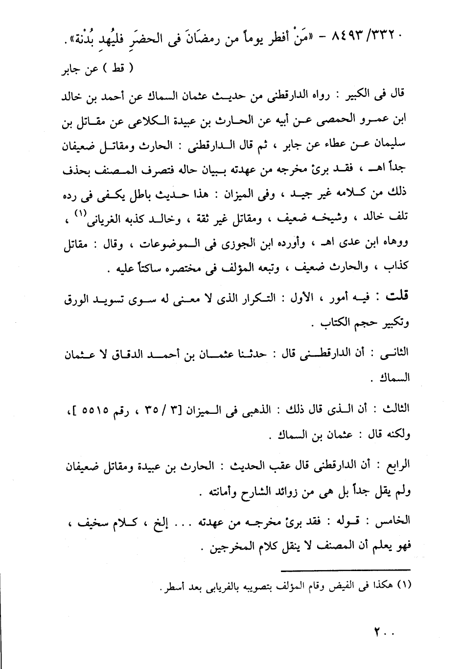 قلت: فيه أمور، الأول: التكرار الذي لا معنى له سوى تسويد الورق وتكبير حجم الكتاب.