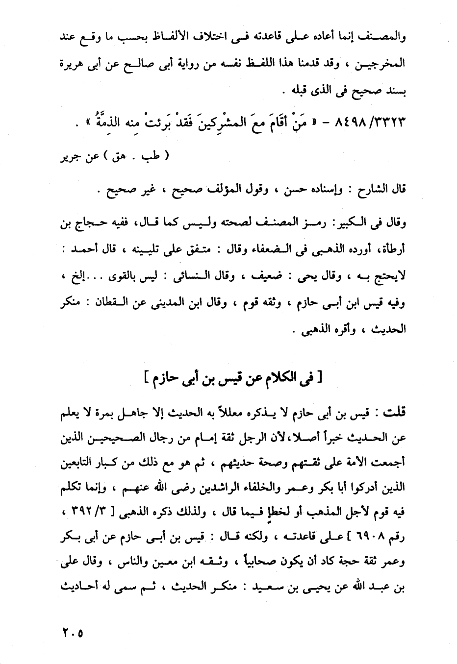 قلت: قيس بن أبي حازم لا يذكره معللًا به الحديث إلا جاهل بمرة لا يعلم عن الحديث خبرًا أصلا, لأن الرجل ثقة إمام من رجال الصحيحين الذين أجمعت الأمة على ثقتهم وصحة حديثهم، ثم هو مع ذلك من كبار التابعين الذين أدركوا أبا بكر وعمر والخلفاء الراشدين رضي اللَّه عنهم، وإنما تكلم فيه قوم لأجل المذهب أو لخطإٍ فيما قال، ولذلك ذكره الذهبى [3/ 392، رقم 6908] على قاعدته، ولكنه قال: قيس بن أبي حازم عن أبي بكر وعمر ثقة حجة كاد أن يكون صحابيًا، وثقه ابن معين والناس، وقال على بن عبد اللَّه عن يحيى بن سعيد: منكر الحديث، ثم سمى له أحاديث