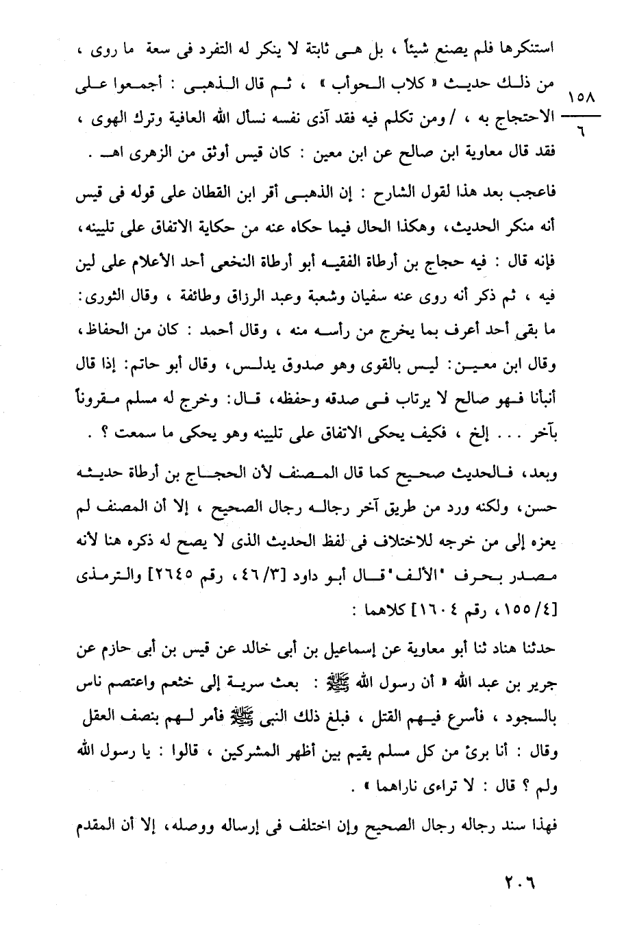 استنكرها فلم يصنع شيئًا، بل هي ثابتة لا ينكر له التفرد في سعة ما روى، من ذلك حديث "كلاب الحوأب"، ثم قال الذهبى: أجمعوا على الاحتجاج به، ومن تكلم فيه فقد آذى نفسه نسأل اللَّه العافية وترك الهوى، فقد قال معاوية ابن صالح عن ابن معين: كان قيس أوثق من الزهرى اهـ.