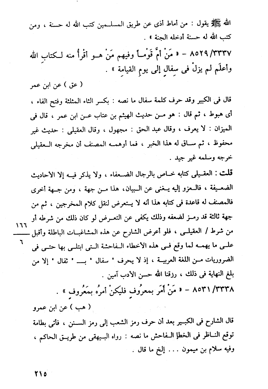 قلت: العقيلى كتابه خاص بالرجال الضعفاء, ولا يذكر فيه إلا الأحاديث الضعيفة، فالعزو إليه يغنى عن البيان، هذا من جهة، ومن جهة أخرى فالمصنف له قاعدة في كتابه هذا أنه لا يتعرض لنقل كلام المخرجين، ثم من جهة ثالثة قد رمز لضعفه وذلك يكفي عن التعرض لو كان ذلك من شرطه أو من شرط العقيلى، فلو أعرض الشارح عن هذه المشاغبات الباطلة وأقبل على ما يهمه لما وقع في هذه الأخطاء الفاحشة التي ابتلى بها حتى في الضروريات من اللغة العربية، إذ لا يحرف "سفال" بـ "ثفال" إلا من بلغ النهاية في ذلك، رزقنا اللَّه حسن الأدب آمين.