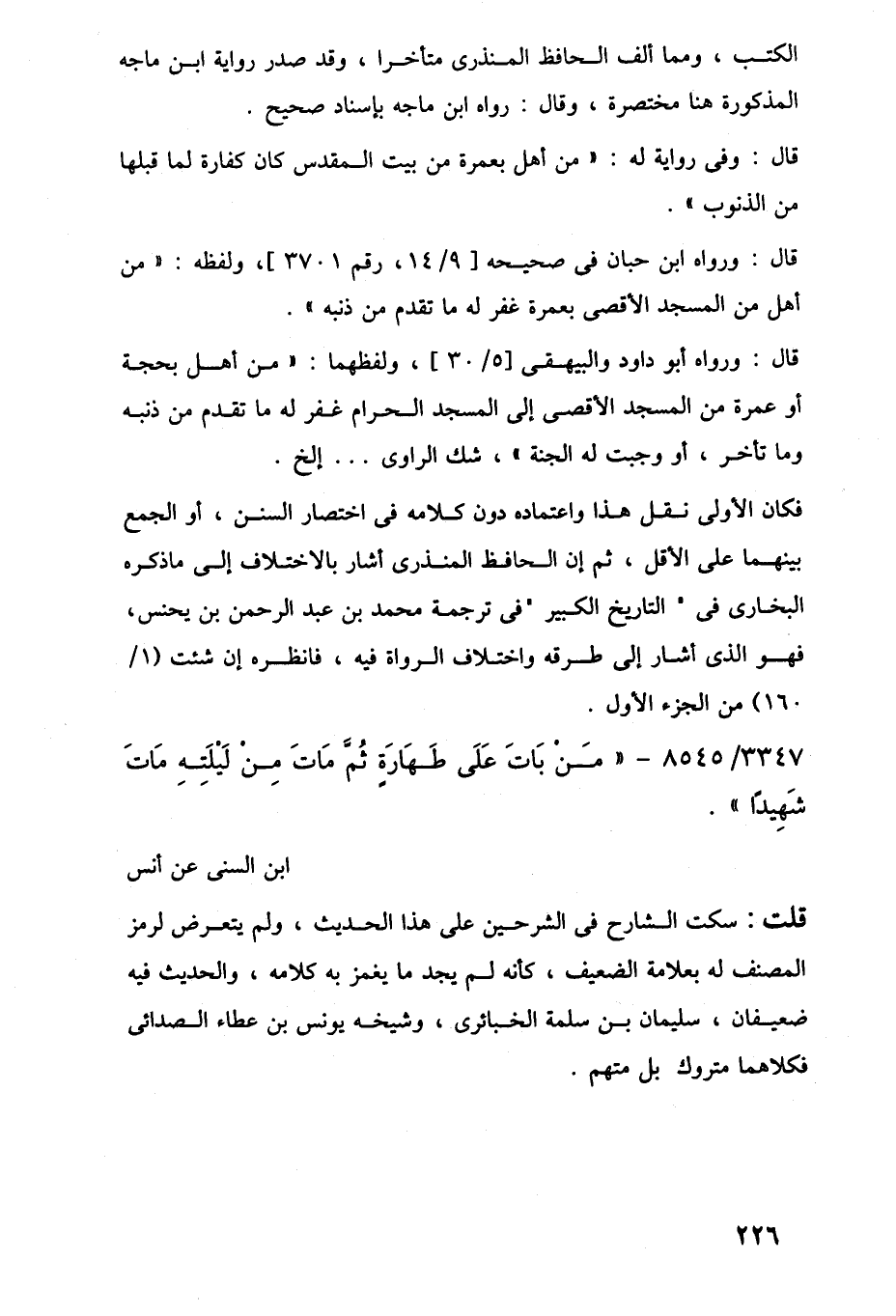 الكتب، ومما ألف الحافظ المنذرى متأخرا، وقد صدر رواية ابن ماجه المذكورة هنا مختصرة، وقال: رواه ابن ماجه بإسناد صحيح.