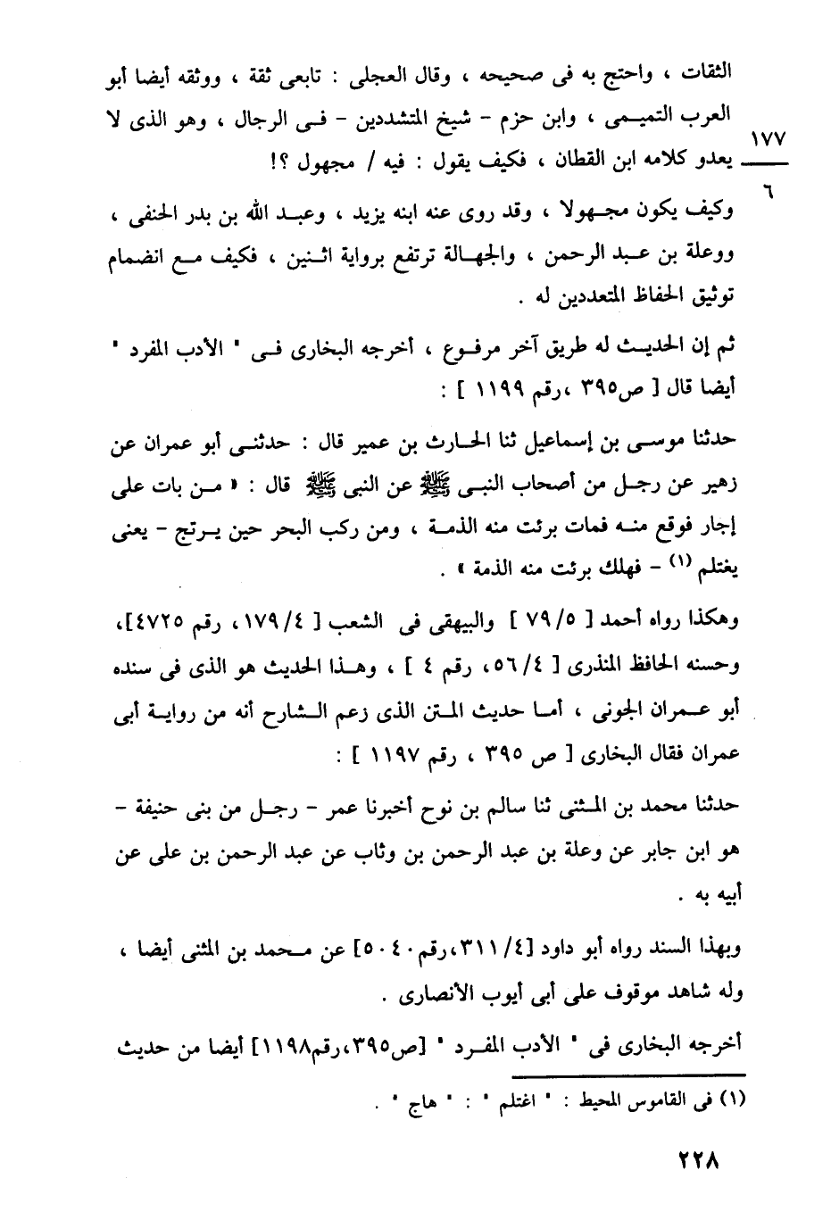 وهكذا رواه أحمد [5/ 79] والبيهقى في الشعب [4/ 179, رقم 4725]، وحسنه الحافظ المنذرى [4/ 56، رقم 4]، وهذا الحديث هو الذي في سنده أبو عمران الجونى، أما حديث المتن الذي زعم الشارح أنه من رواية أبي عمران فقال البخارى [ص 395، رقم 1197]: