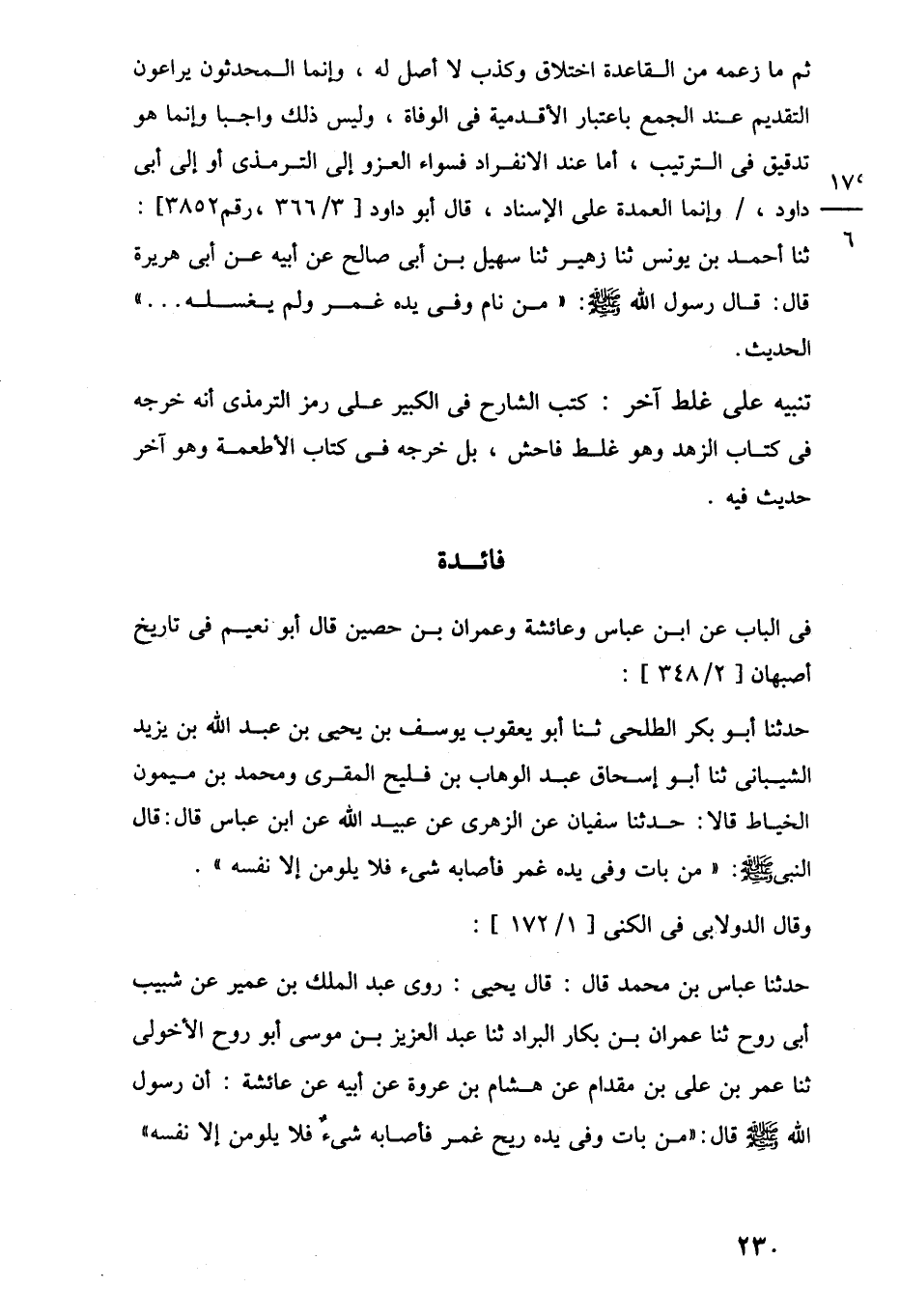 ثم ما زعمه من القاعدة اختلاق وكذب لا أصل له، وإنما المحدثون يراعون التقديم عند الجمع باعتبار الأقدمية في الوفاة، وليس ذلك واجبا وإنما هو تدقيق في الترتيب، أما عند الانفراد فسواء العزو إلى الترمذى أو إلى أبي داود، وإنما العمدة على الإسناد، قال أبو داود [3/ 366، رقم 3852]: ثنا أحمد بن يونس ثنا زهير ثنا سهيل بن أبي صالح عن أبيه عن أبي هريرة قال: قال رسول اللَّه -صلى اللَّه عليه وسلم-: "من نام وفي يده غمر ولم يغسله. . . " الحديث.