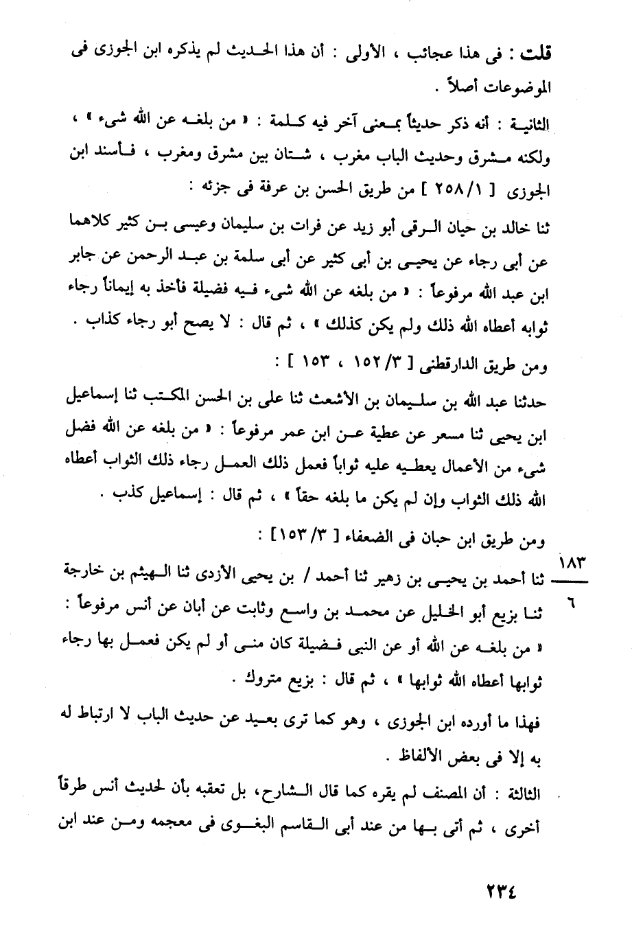 الثانية: أنه ذكر حديثا بمعنى آخر فيه كلمة: "من بلغه عن اللَّه شيء"، ولكنه مشرق وحديث الباب مغرب، شتان بين مشرق ومغرب، فأسند ابن الجوزى [1/ 258] من طريق الحسن بن عرفة في جزئه: