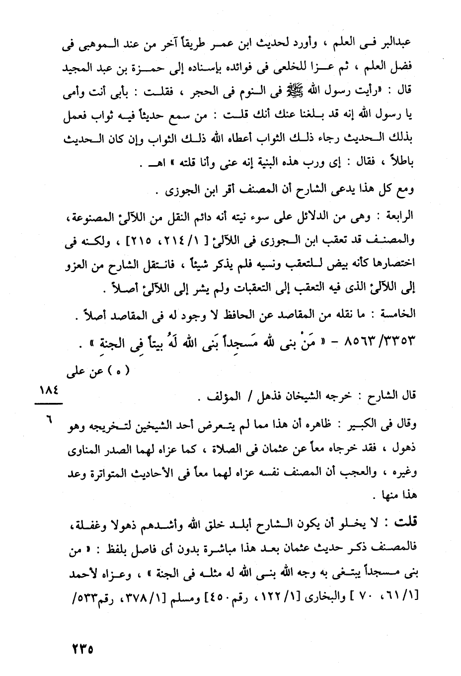 قلت: لا يخلو أن يكون الشارح أبلد خلق اللَّه وأشدهم ذهولا وغفلة، فالمصنف ذكر حديث عثمان بعد هذا مباشرة بدون أى فاصل بلفظ: "من بنى مسجدًا يبتغى به وجه اللَّه بنى اللَّه له مثله في الجنة"، وعزاه لأحمد [1/ 61, 70] والبخارى [1/ 122، رقم 450] ومسلم [1/ 378، رقم 533/