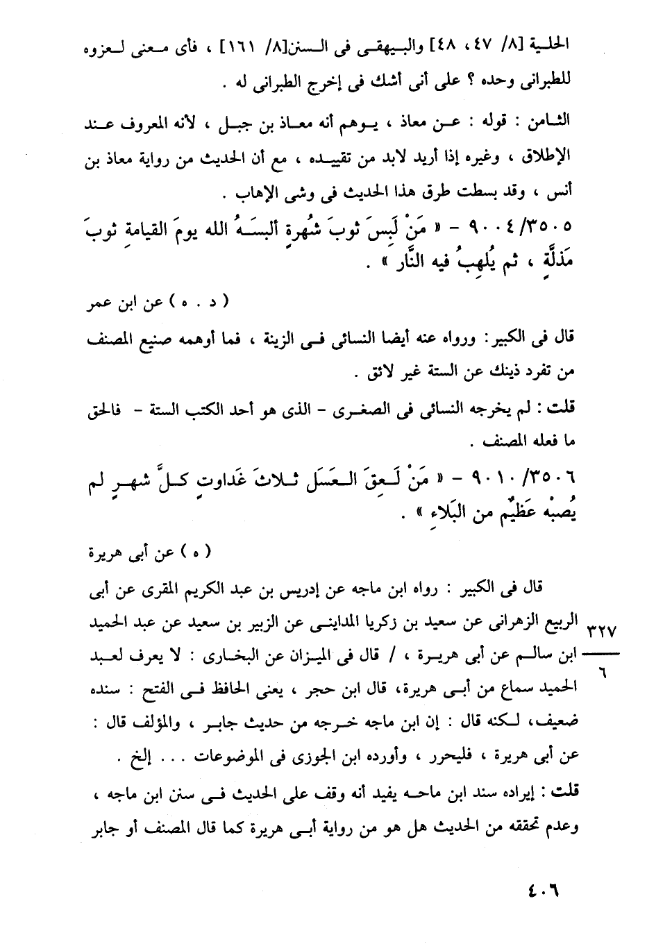 قال في الكبير: رواه ابن ماجه عن إدريس بن عبد الكريم المقرى عن أبي الربيع الزهرانى عن سعيد بن زكريا المداينى عن الزبير بن سعيد عن عبد الحميد ابن سالم عن أبي هريرة، قال في الميزان عن البخارى: لا يعرف لعبد الحميد سماع من أبي هريرة، قال ابن حجر، يعنى الحافظ في الفتح: سنده ضعيف، لكنه قال: إن ابن ماجه خرجه من حديث جابر، والمؤلف قال: عن أبي هريرة، فليحرر، وأورده ابن الجوزى في الموضوعات. . . إلخ.
