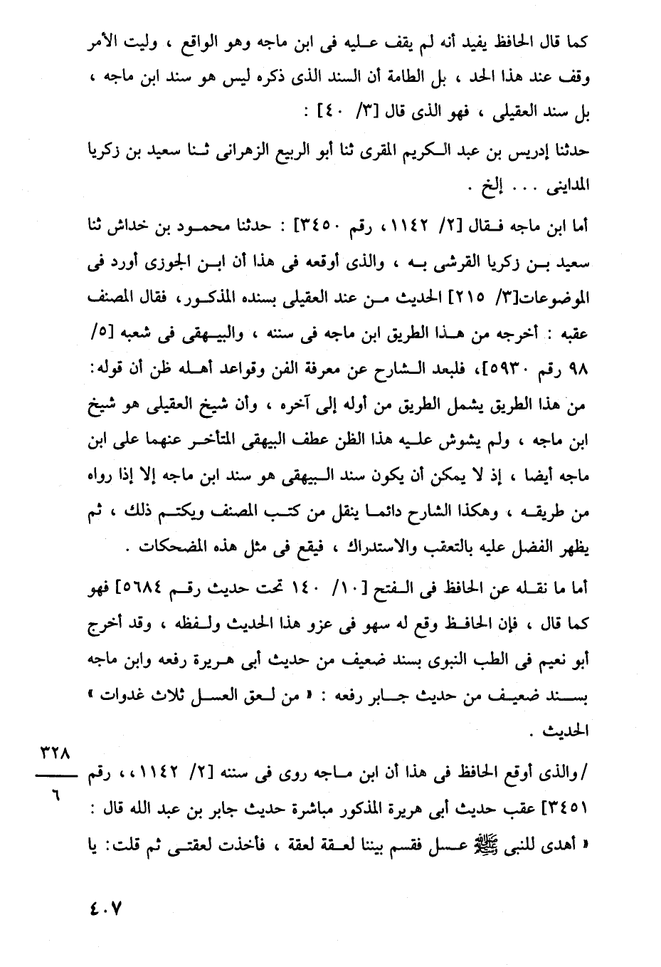 أما ما نقله عن الحافظ، في الفتح [10/ 140 تحت حديث رقم 5684] فهو كما قال، فإن الحافظ وقع له سهو في عزو هذا الحديث ولفظه، وقد أخرج أبو نعيم في الطب النبوى بسند ضعيف من حديث أبي هريرة رفعه وابن ماجه بسند ضعيف من حديث جابر رفعه: "من لعق العسل ثلاث غدوات" الحديث.