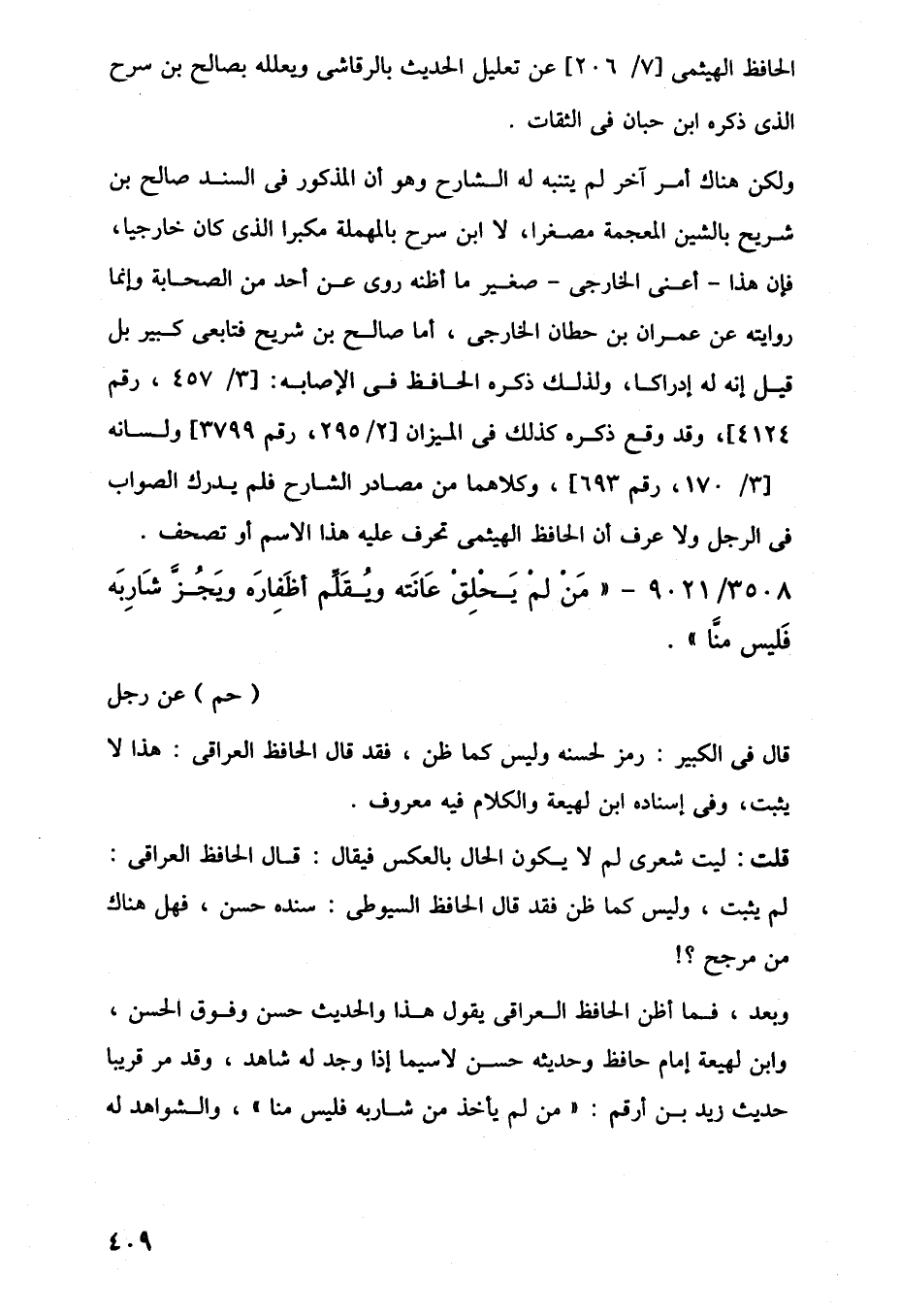 ولكن هناك أمر آخر لم يتنبه له الشارح وهو أن المذكور في السند صالح بن شريح بالشين المعجمة مصغرا، لا ابن سرح بالمهملة مكبرا الذي كان خارجيا، فإن هذا -أعنى الخارجى- صغير ما أظنه روى عن أحد من الصحابة وإنما روايته عن عمران بن حطان الخارجى، أما صالح بن شريح فتابعى كبير بل قيل إنه له إدراكا، ولذلك ذكره الحافظ في الإصابه: [3/ 457، رقم 4124]، وقد وقع ذكره كذلك في الميزان [2/ 295، رقم 3799] ولسانه [3/ 170، رقم 693]، وكلاهما من مصادر الشارح فلم يدرك الصواب في الرجل ولا عرف أن الحافظ الهيثمى تحرف عليه هذا الاسم أو تصحف.
