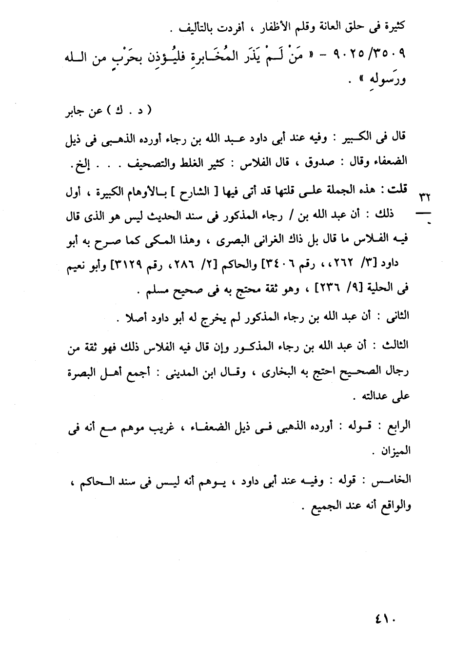 قلت: هذه الجملة على قلتها قد أتى فيها [الشارح] بالأوهام الكبيرة، أول ذلك: أن عبد اللَّه بن رجاء المذكور في سند الحديث ليس هو الذي قال فيه الفلاس ما قال بل ذاك الغرانى البصرى، وهذا المكى كما صرح به أبو داود [3/ 262، رقم 3406] والحاكم [2/ 286، رقم 3129] وأبو نعيم في الحلية [9/ 236]، وهو ثقة محتج به في صحيح مسلم.