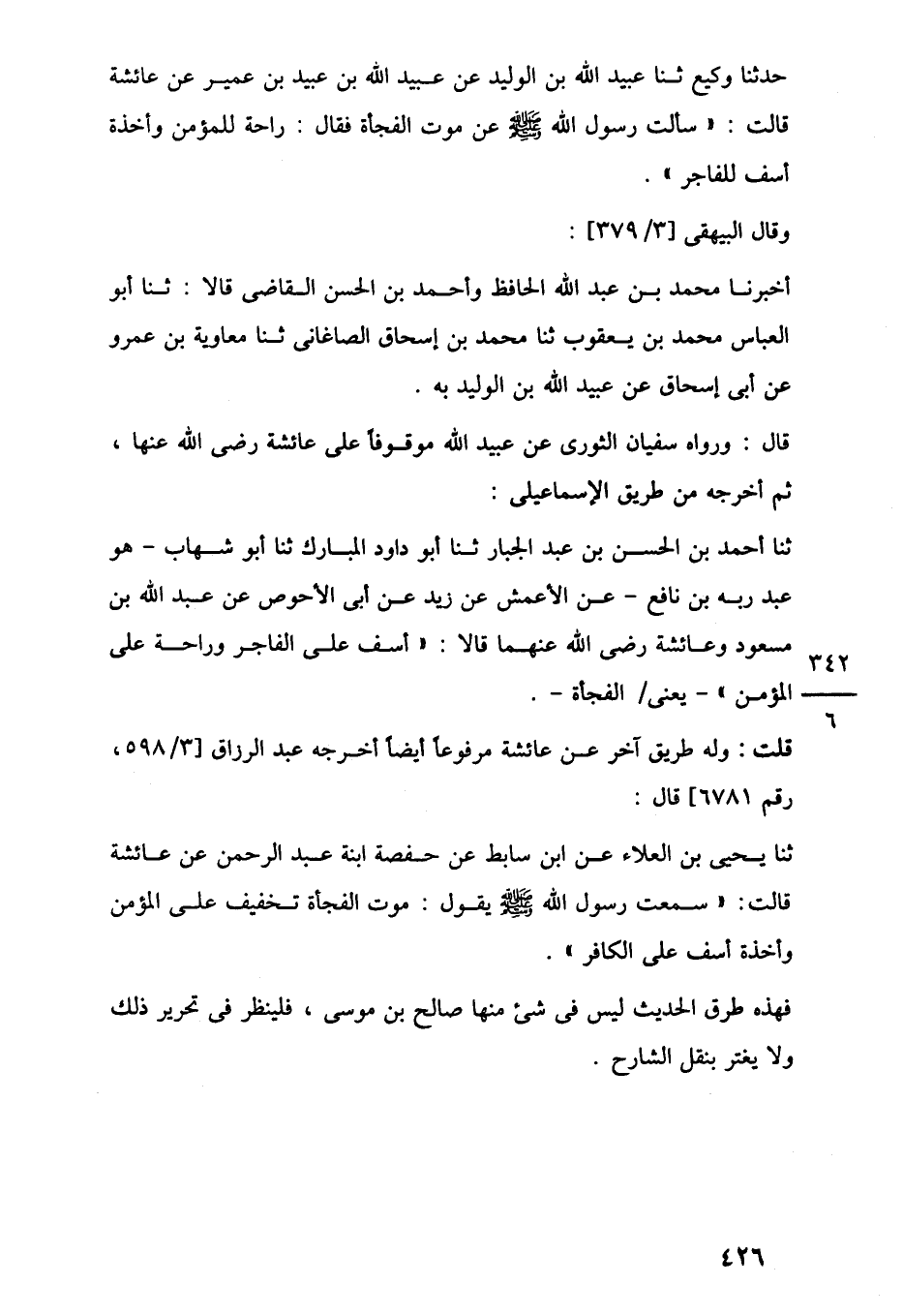 ثنا أحمد بن الحسن بن عبد الجبار ثنا أبو داود المبارك ثنا أبو شهاب -هو عبد ربه بن نافع- عن الأعمش عن زيد عن أبي الأحوص عن عبد اللَّه بن مسعود وعائشة رضي اللَّه عنهما قالا: "أسف على الفاجر وراحة على المؤمن" -يعنى الفجأة-.