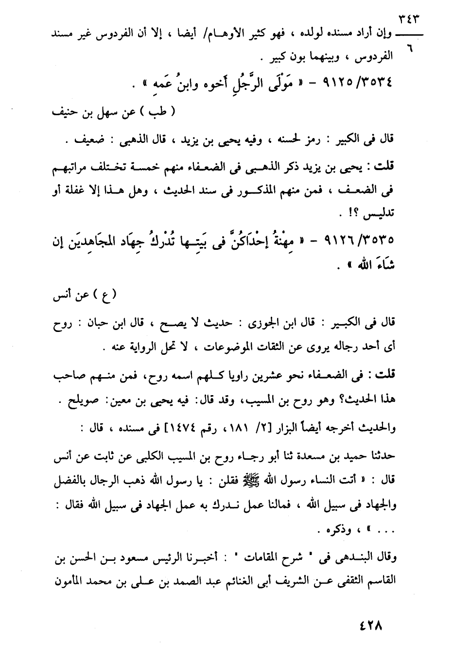 حدثنا حميد بن مسعدة ثنا أبو رجاء روح بن المسيب الكلبى عن ثابت عن أنس قال: "أتت النساء رسول اللَّه -صلى اللَّه عليه وسلم- فقلن: يا رسول اللَّه ذهب الرجال بالفضل والجهاد في سبيل اللَّه، فما لنا عمل ندرك به عمل الجهاد في سبيل اللَّه فقال:. . . "، وذكره.