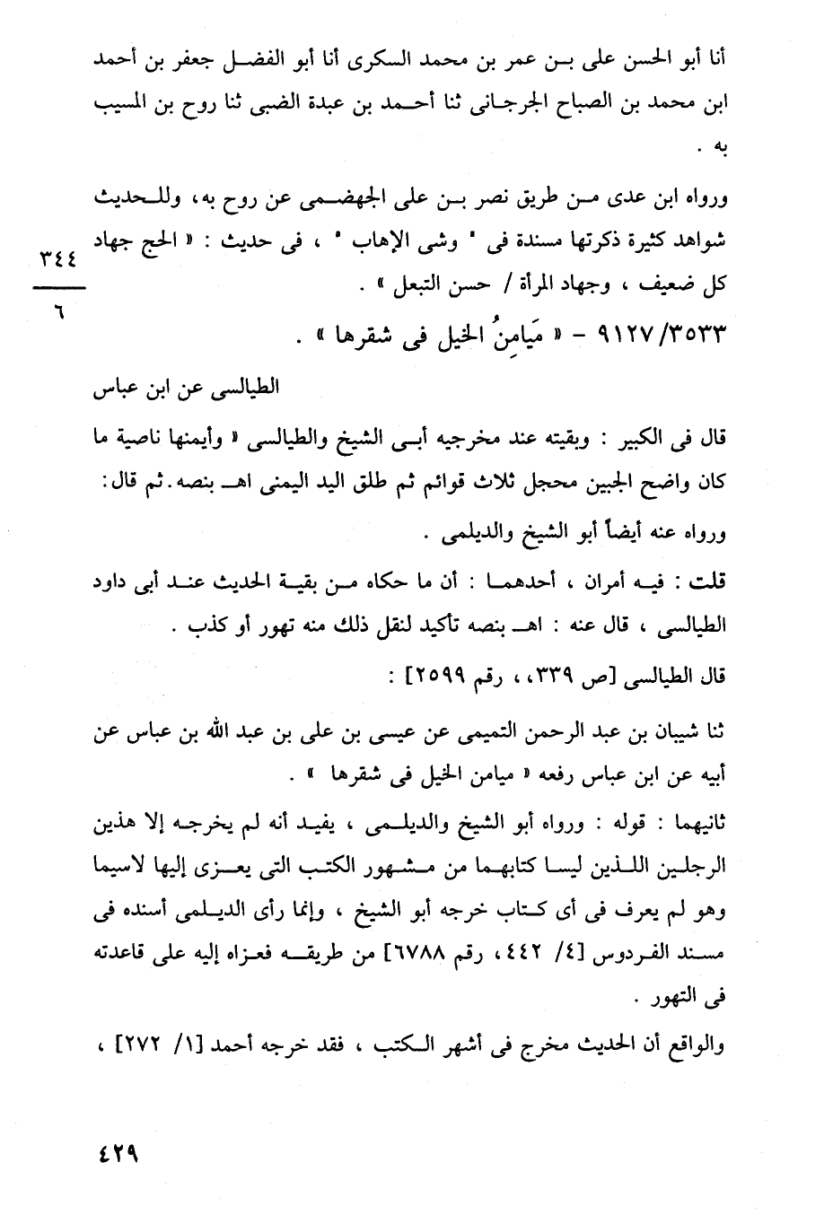 قال في الكبير: وبقيته عند مخرجيه أبي الشيخ والطيالسى "وأيمنها ناصية ما كان واضح الجبين محجل ثلاث قوائم ثم طلق اليد اليمنى اهـ بنصه. ثم قال: ورواه عنه أيضًا أبو الشيخ والديلمى.