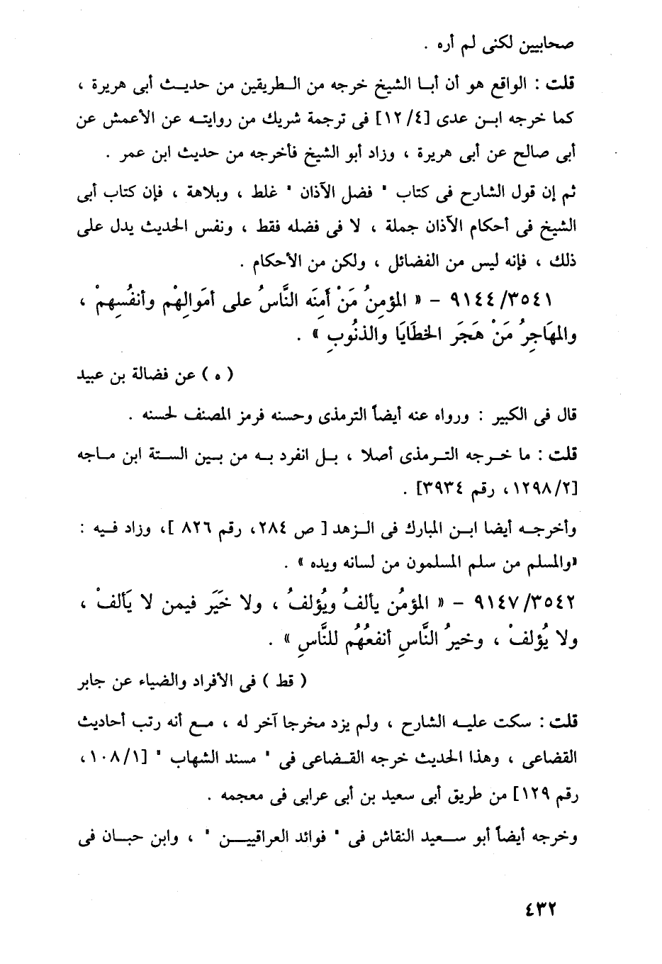 3541/ 9144 - "المؤمِنُ مَنْ أَمِنَه النَّاسُ على أمَوالِهْم وأنفُسِهمْ، والمهَاجِرُ مَنْ هَجَر الخطَايَا والذنُوبِ".