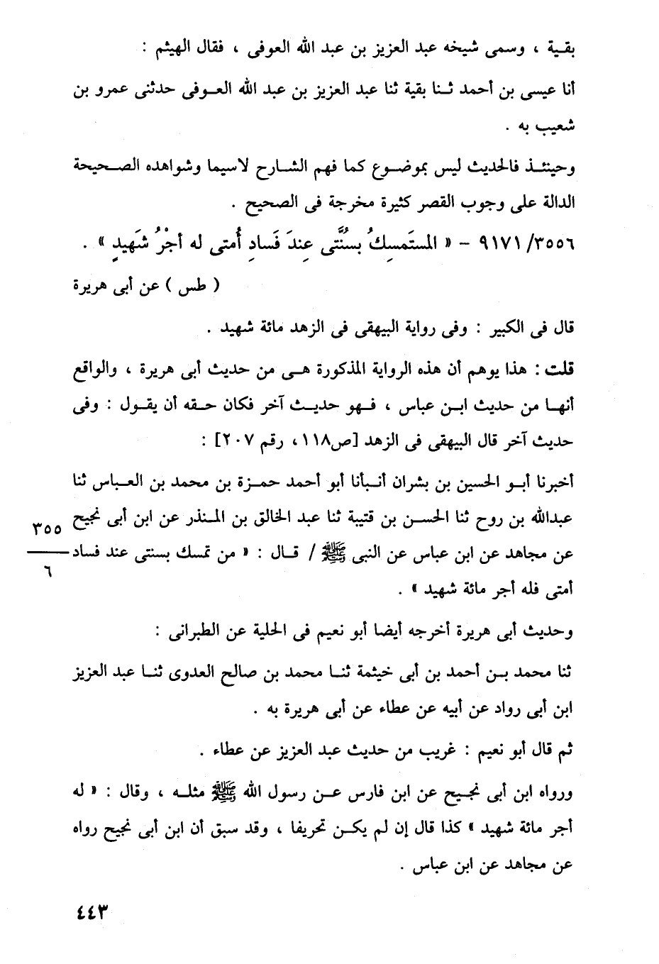3556/ 9171 - "المستَمسِكُ بسُنَّتي عِندَ فَسادِ أُمتى له أجْرُ شَهيدٍ".