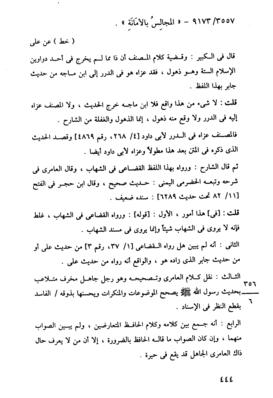 الثالث: نقل كلام العامرى وتصحيحه وهو رجل جاهل مخرف متلاعب بحديث رسول اللَّه -صلى اللَّه عليه وسلم- يصحح الموضوعات والمنكرات ويحسنها بذوقه الفاسد بقطع النظر في الإسناد.