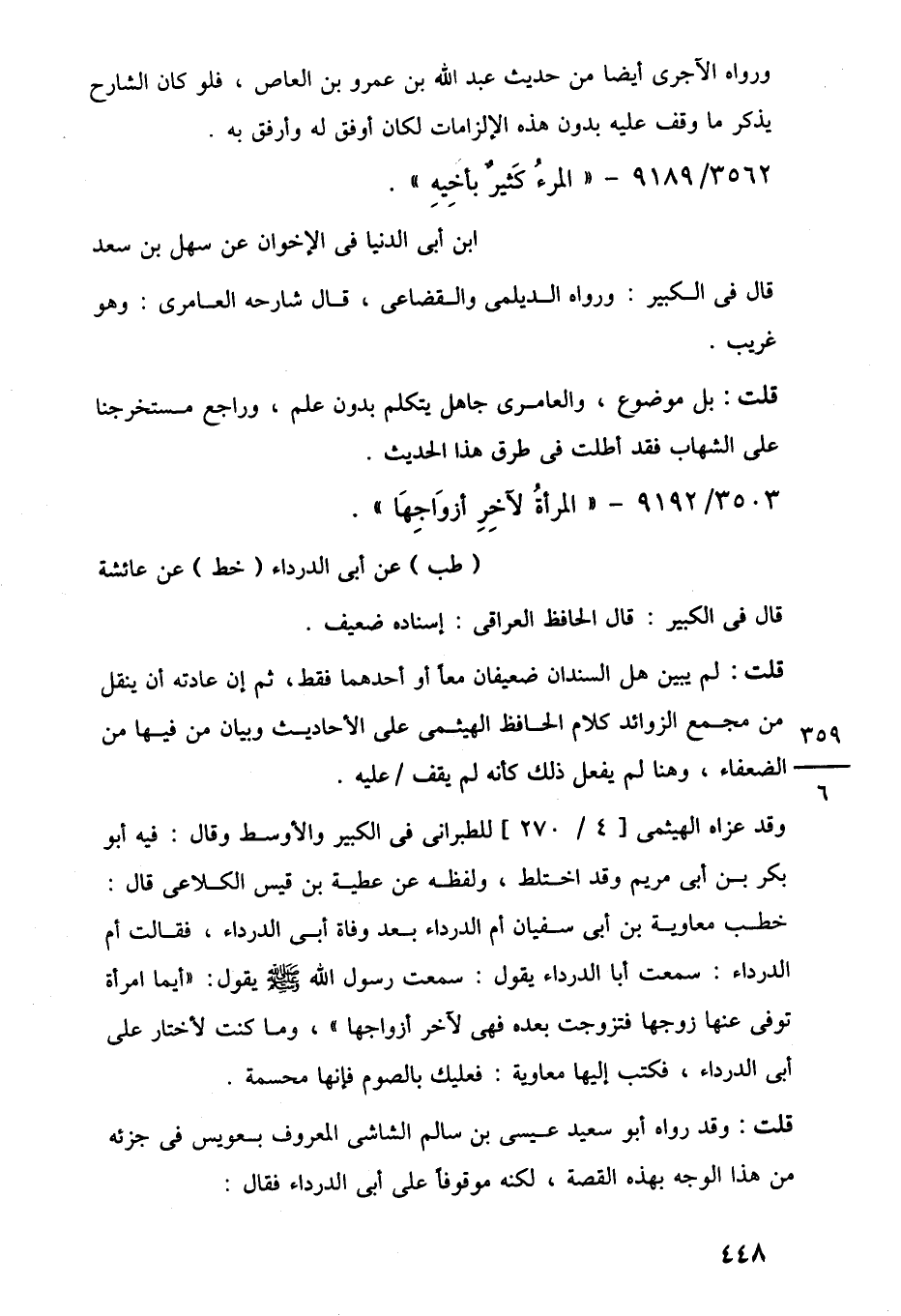 وقد عزاه الهيثمى [4/ 270] للطبرانى في الكبير والأوسط وقال: فيه أبو بكر بن أبي مريم وقد اختلط، ولفظه عن عطية بن قيس الكلاعى قال: خطب معاوبة بن أبي سفيان أم الدرداء بعد وفاة أبي الدرداء، فقالت أم الدرداء: سمعت أبا الدرداء يقول: سمعت رسول اللَّه -صلى اللَّه عليه وسلم- يقول: "أيما امرأة توفى عنها زوجها فتزوجت بعده فهى لآخر أزواجها"، وما كنت لأختار على أبي الدرداء، فكتب إليهما معاوية: فعليك بالصوم فإنها محسمة.