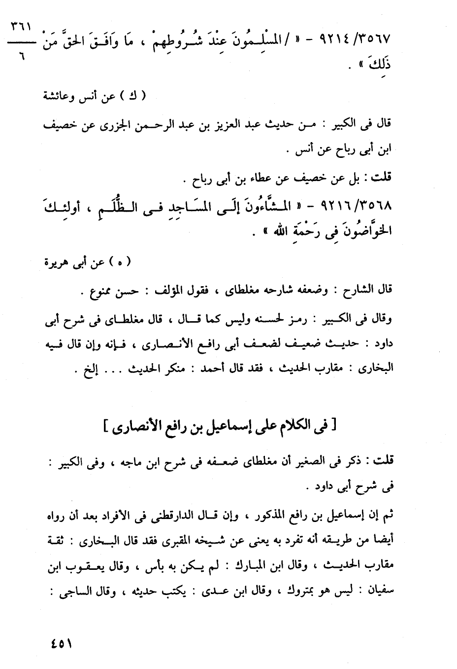 ثم إن إسماعيل بن رافع المذكور، وإن قال الدارقطنى في الأفراد بعد أن رواه أيضًا من طريقه أنه تفرد به يعنى عن شيخه المقبرى فقد قال البخارى: ثقة مقارب الحديث، وقال ابن المبارك: لم يكن به بأس، وقال يعقوب ابن سفيان: ليس هو بمتروك، وقال ابن عدى: يكتب حديثه، وقال الساجى: