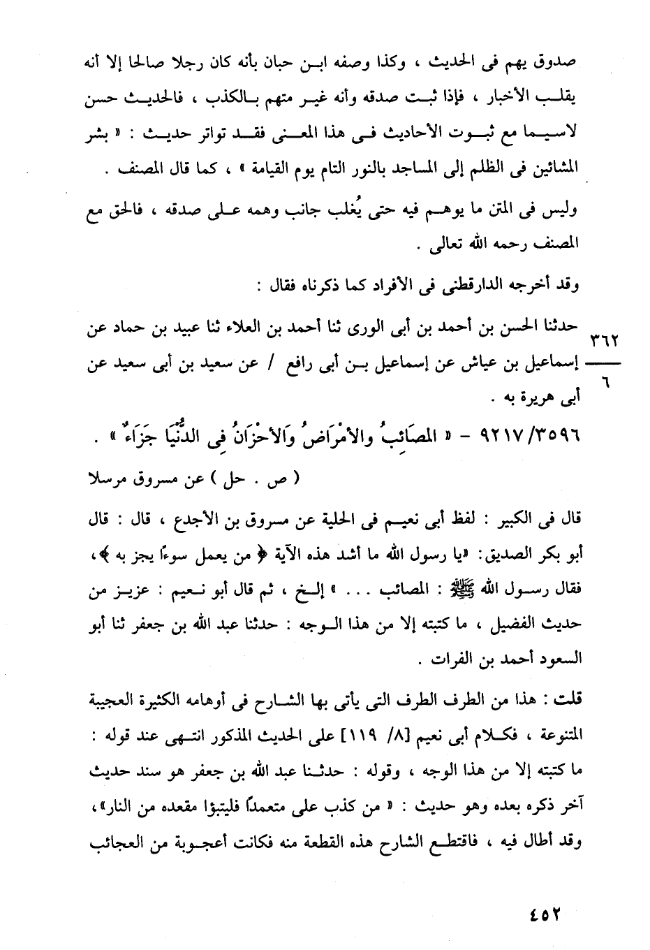 قال في الكبير: لفظ أبي نعيم في الحلية عن مسروق بن الأجدع، قال: قال أبو بكر الصديق: "يا رسول اللَّه ما أشد هذه الآية {مَنْ يَعْمَلْ سُوءًا يُجْزَ بِهِ}، فقال رسول اللَّه -صلى اللَّه عليه وسلم-: المصائب. . . " إلخ، ثم قال أبو نعيم: عزيز من حديث الفضيل، ما كتبته إلا من هذا الوجه: حدثنا عبد اللَّه بن جعفر ثنا أبو السعود أحمد بن الفرات.